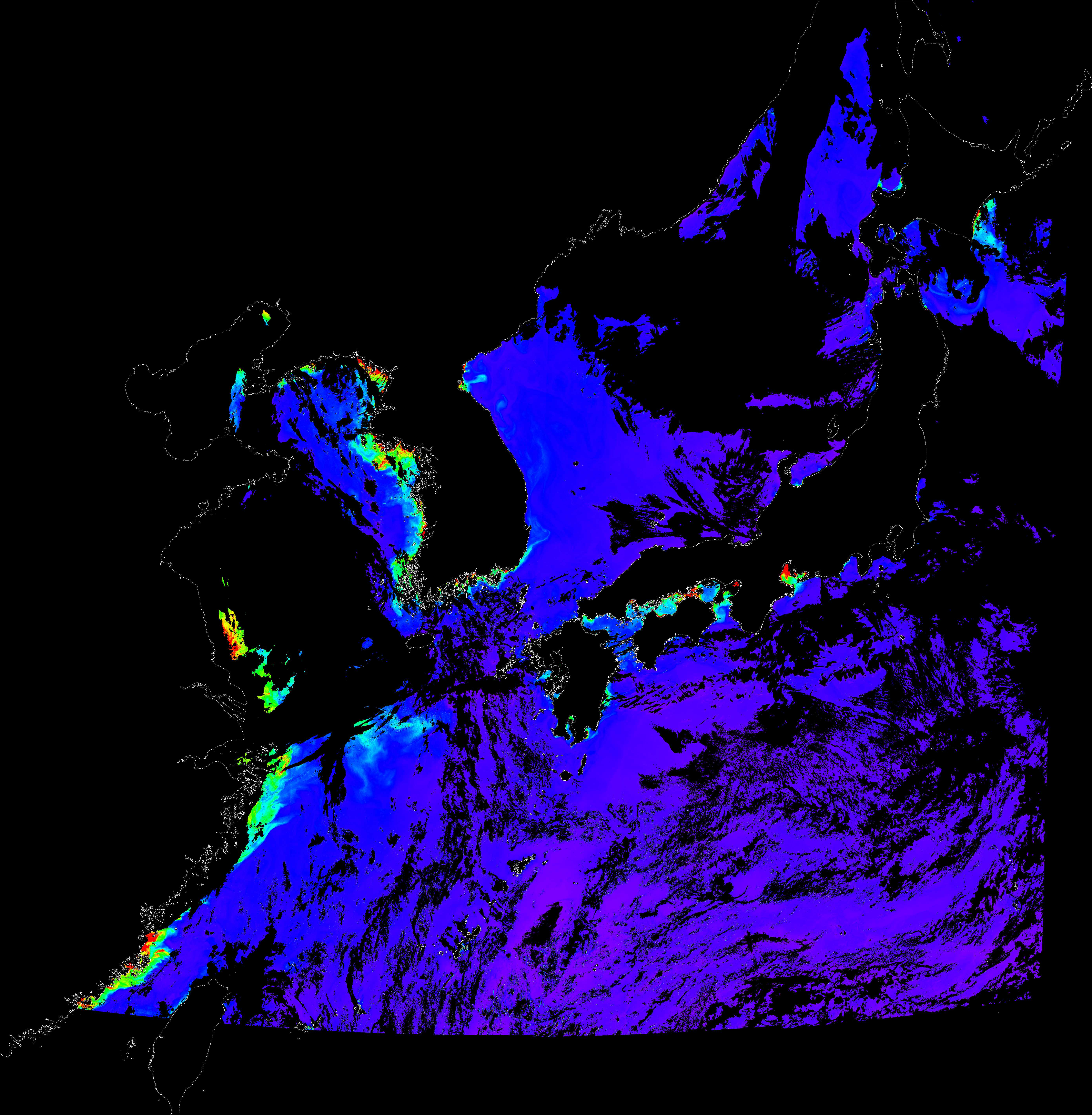 o 2018년 07월 24일 천리안 GOCI 클로로필 a 위성영상입니다. [ GOCI : Geostationary Ocean Color Imager ] o 농도분포는 하단 범례를 참고하시기 바랍니다. o 검은색은 구름을 나타냅니다.