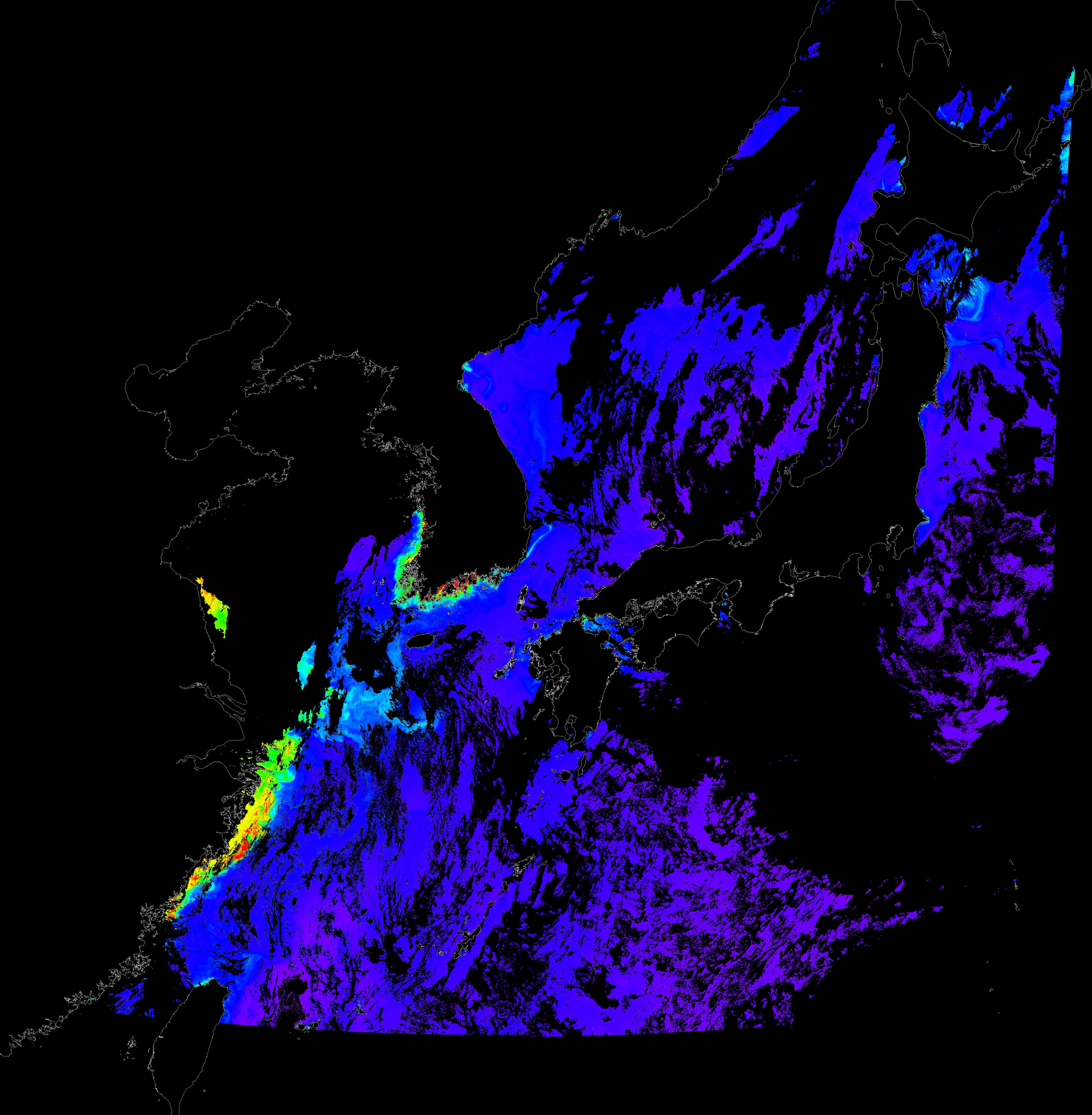 o 2018년 07월 26일 천리안 GOCI 클로로필 a 위성영상입니다. [ GOCI : Geostationary Ocean Color Imager ] o 농도분포는 하단 범례를 참고하시기 바랍니다. o 검은색은 구름을 나타냅니다.