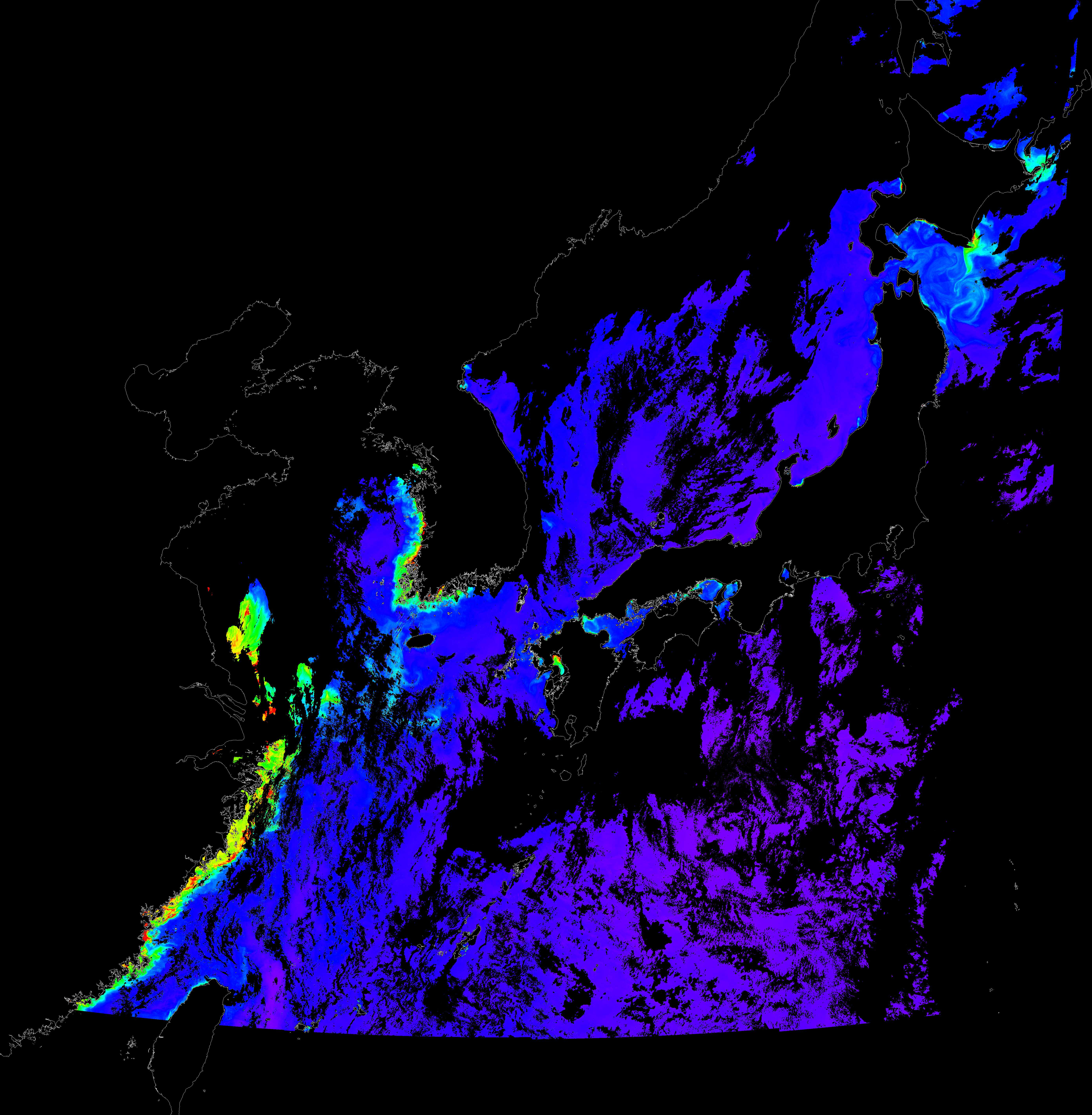 o 2018년 07월 27일 천리안 GOCI 클로로필 a 위성영상입니다. [ GOCI : Geostationary Ocean Color Imager ] o 농도분포는 하단 범례를 참고하시기 바랍니다. o 검은색은 구름을 나타냅니다.