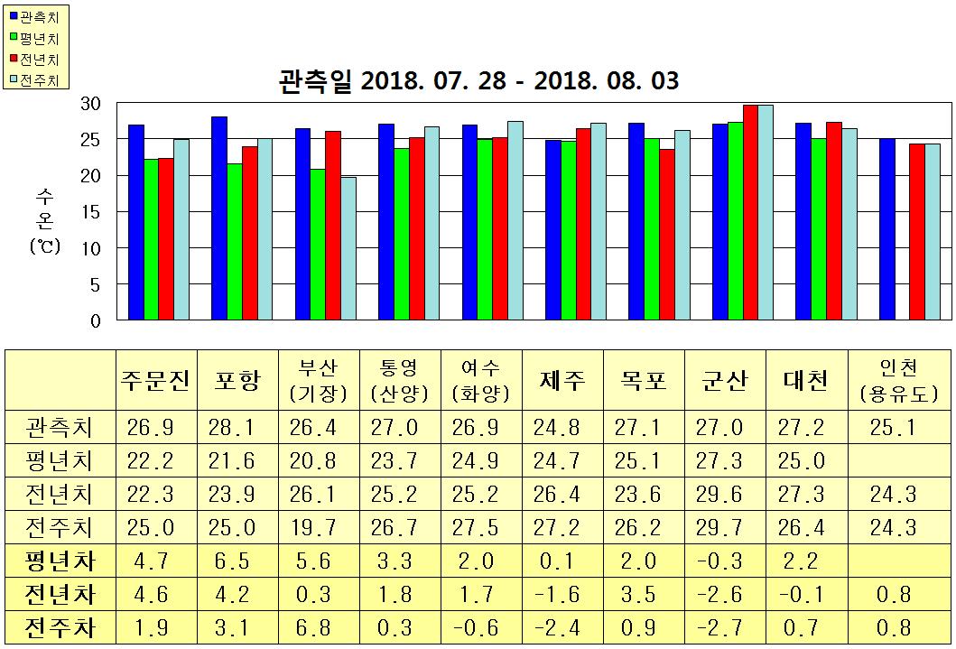 ○ 금주(2018. 07. 28 ~ 2018. 08. 03)의 한반도 연안 표면수온은 동해 연안역에서 섭씨 26.5~28.0도, 남해 연안역 25~27도, 서해 연안역에서 25~27도로 나타납니다. ○ 평년에 비해 동해 연안역은 4.5~6.5도 높게, 제주 비슷함을 제외한 남해 연안역은 2.0~3.5도 높게, 군산 비슷함을 제외한 서해 연안역은 2.0~2.5도 높게 나타납니다. ○ 전년에 비해 기장 비슷함을 제외한 동해 연안역은 4.0~4.5도 높게, 제주 1.6도 낮음을 제외한 남해 연안역은 1.5~2.0도 높게, 대천 비슷함, 군산 2.6도 낮음을 제외한 서해 연안역은 1.0~3.5도 높게 나타납니다.