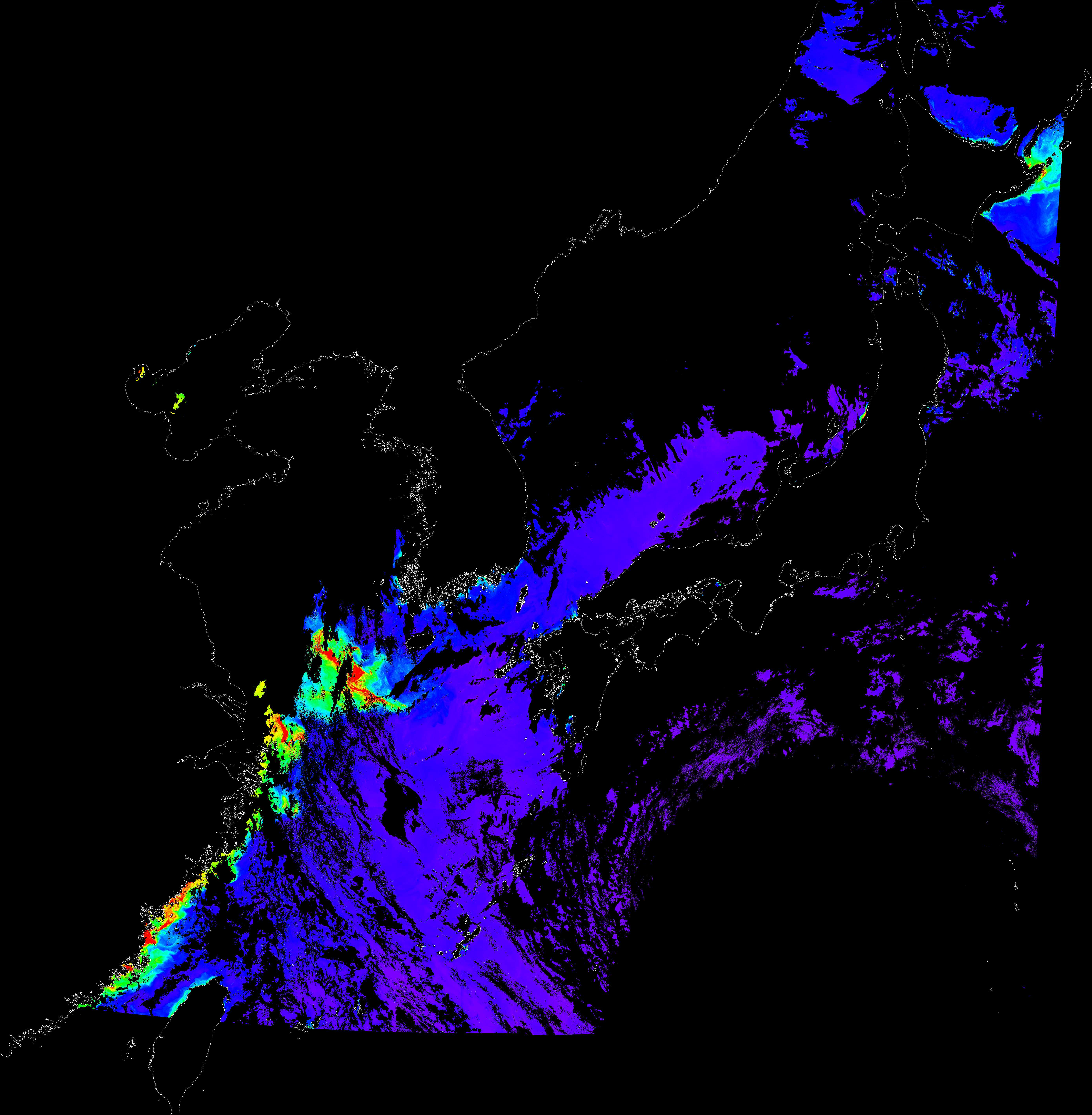 o 2018년 08월 20일 천리안 GOCI 클로로필 a 위성영상입니다. [ GOCI : Geostationary Ocean Color Imager ] o 농도분포는 하단 범례를 참고하시기 바랍니다. o 검은색은 구름을 나타냅니다.