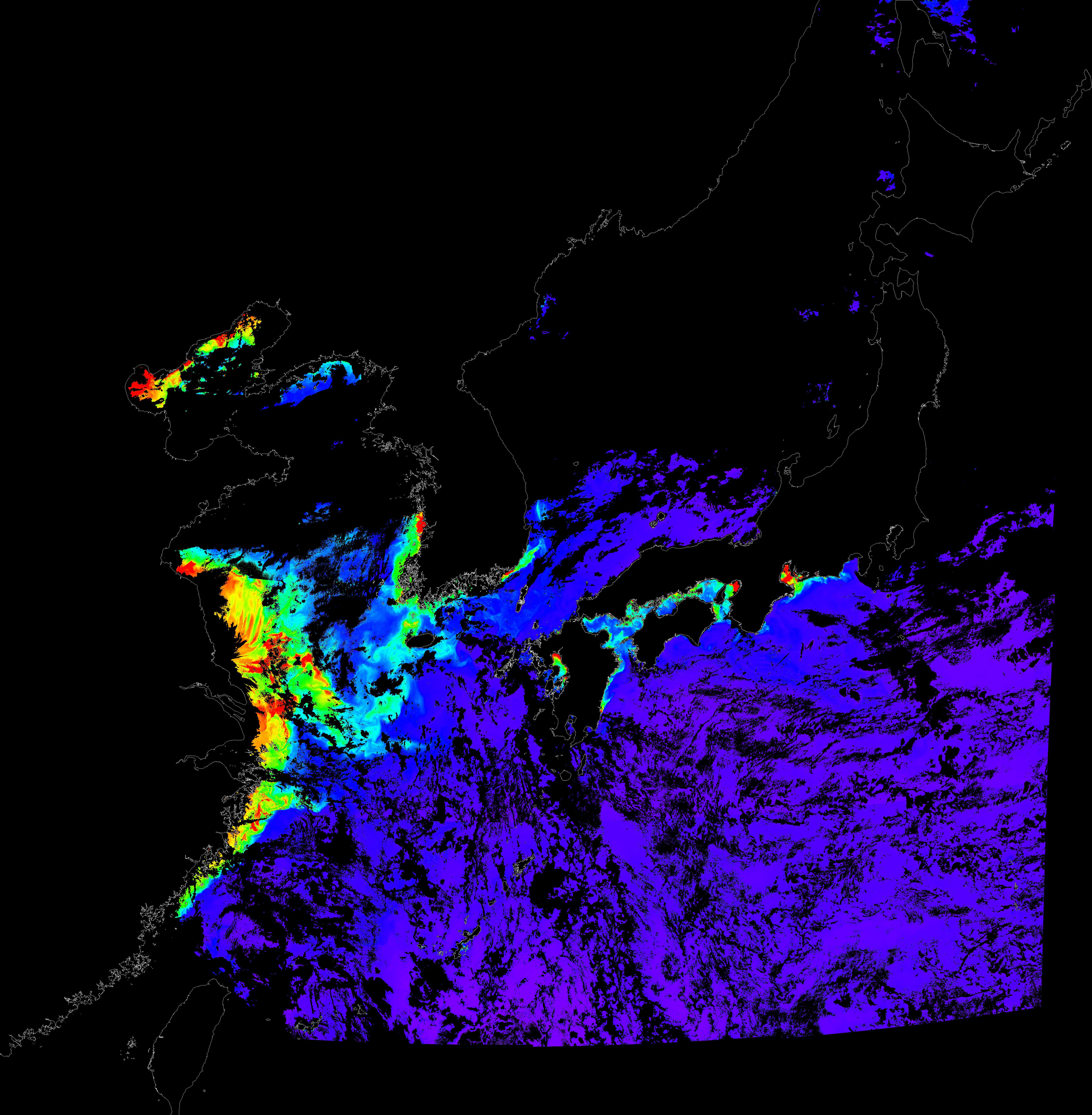 o 2018년 08월 29일 천리안 GOCI 클로로필 a 위성영상입니다. [ GOCI : Geostationary Ocean Color Imager ] o 농도분포는 하단 범례를 참고하시기 바랍니다. o 검은색은 구름을 나타냅니다.