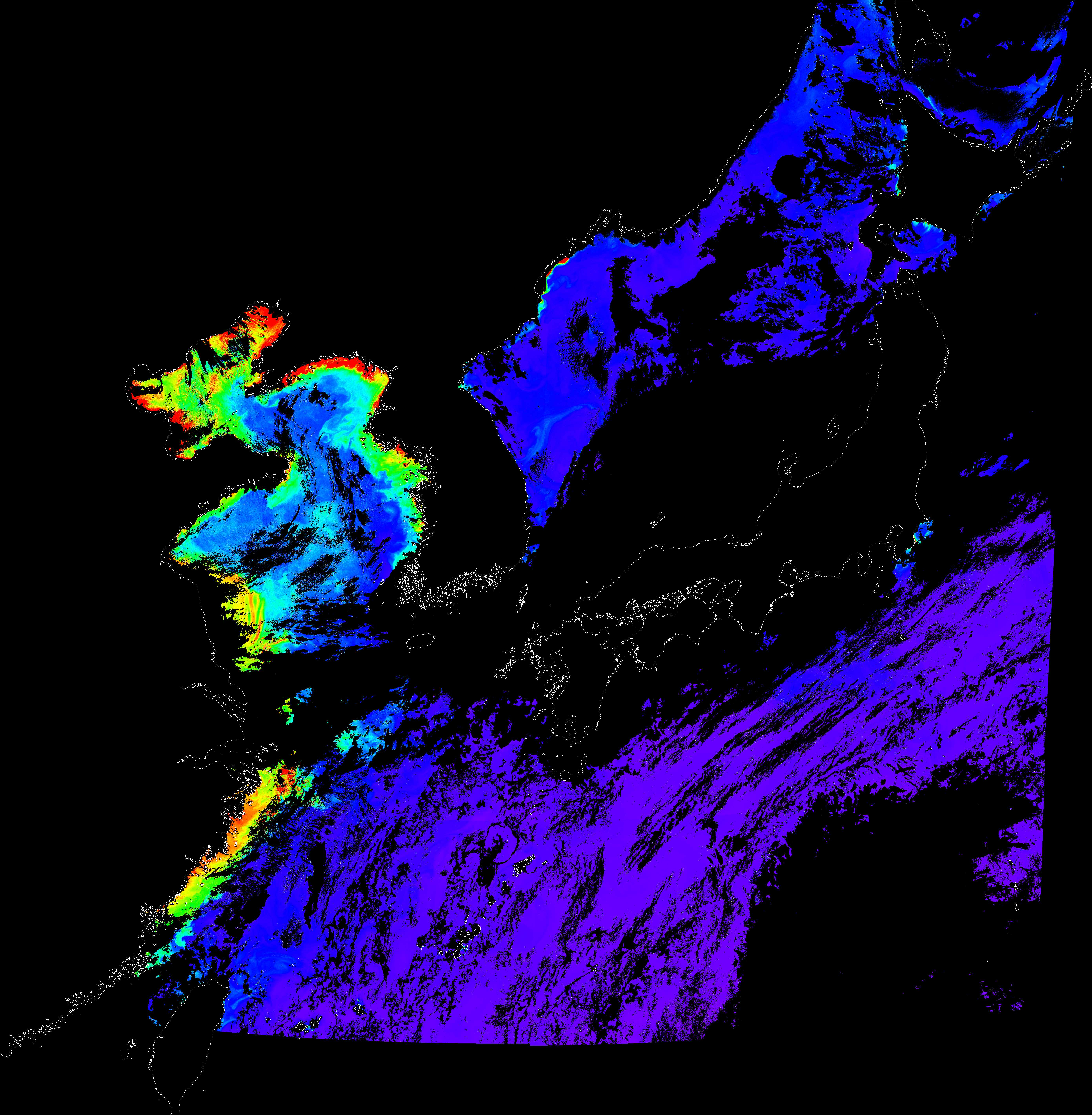 o 2018년 09월 01일 천리안 GOCI 클로로필 a 위성영상입니다. [ GOCI : Geostationary Ocean Color Imager ] o 농도분포는 하단 범례를 참고하시기 바랍니다. o 검은색은 구름을 나타냅니다.