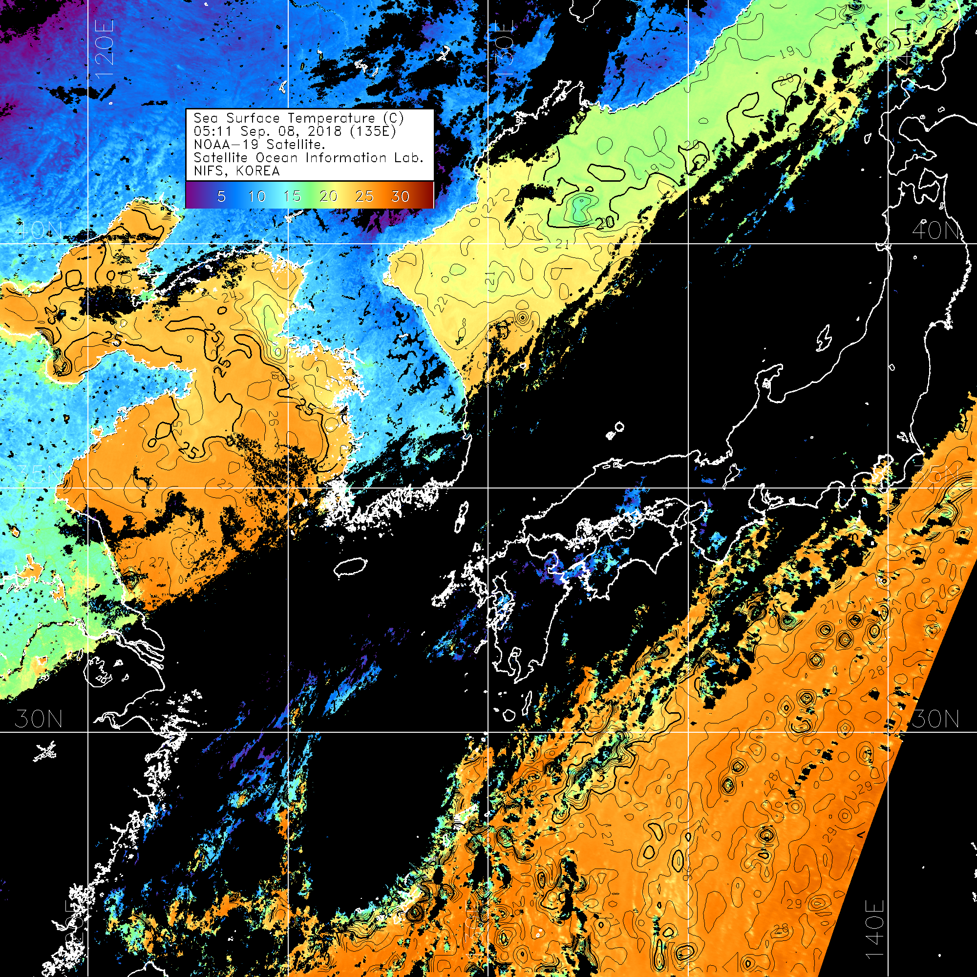 o 2018 년 09 월 08 일 NOAA 위성영상입니다. o 영상 시간 및 수온분포는 범례를 참고하시기 바랍니다. o 검은색은 구름을 나타냅니다. o 그림을 클릭하시면 크게 보실 수 있습니다.