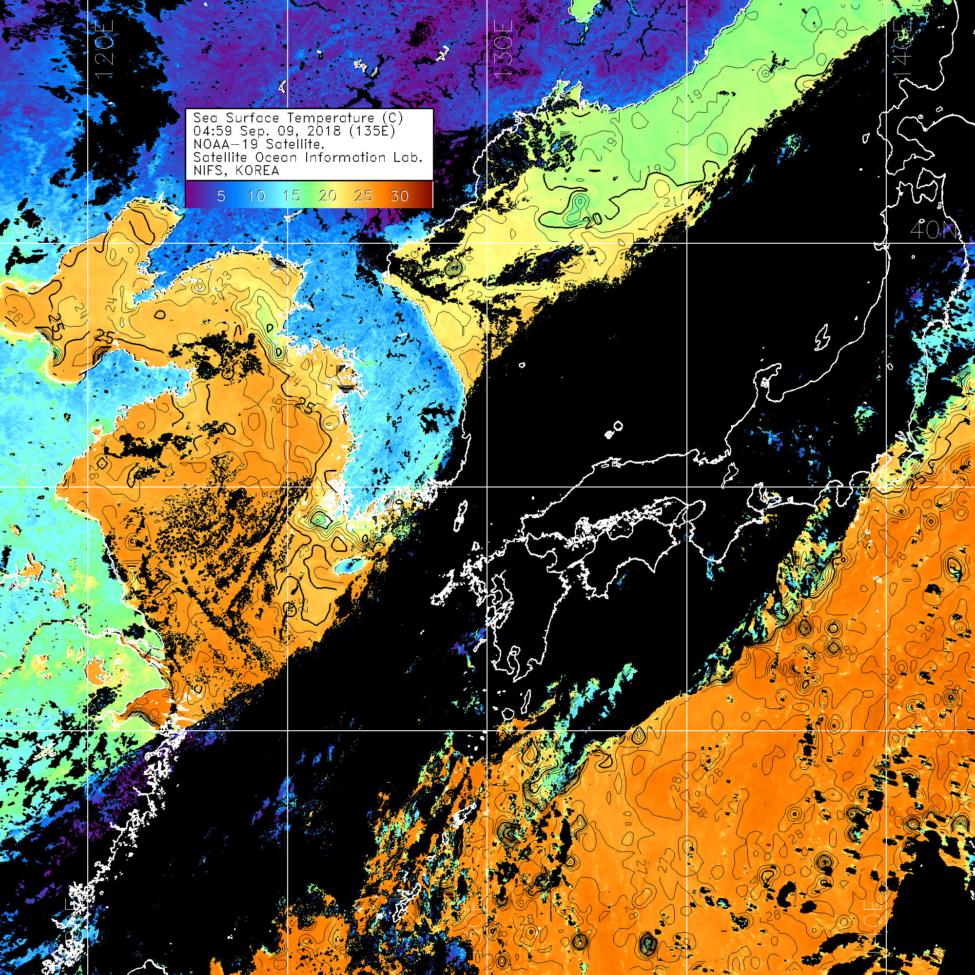 o 2018 년 09 월 09 일 NOAA 위성영상입니다. o 영상 시간 및 수온분포는 범례를 참고하시기 바랍니다. o 검은색은 구름을 나타냅니다. o 그림을 클릭하시면 크게 보실 수 있습니다.