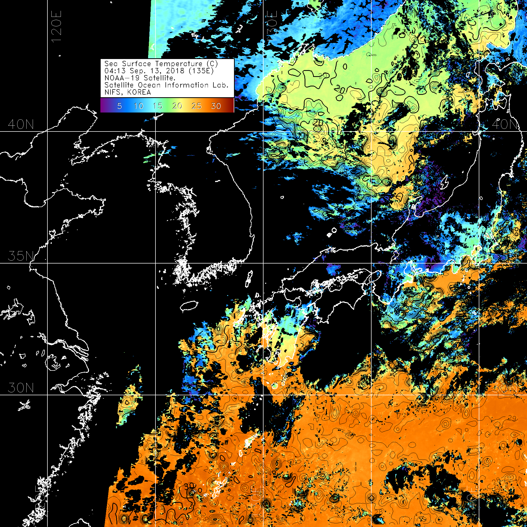 o 2018 년 09 월 13 일 NOAA 위성영상입니다. o 영상 시간 및 수온분포는 범례를 참고하시기 바랍니다. o 검은색은 구름을 나타냅니다. o 그림을 클릭하시면 크게 보실 수 있습니다.