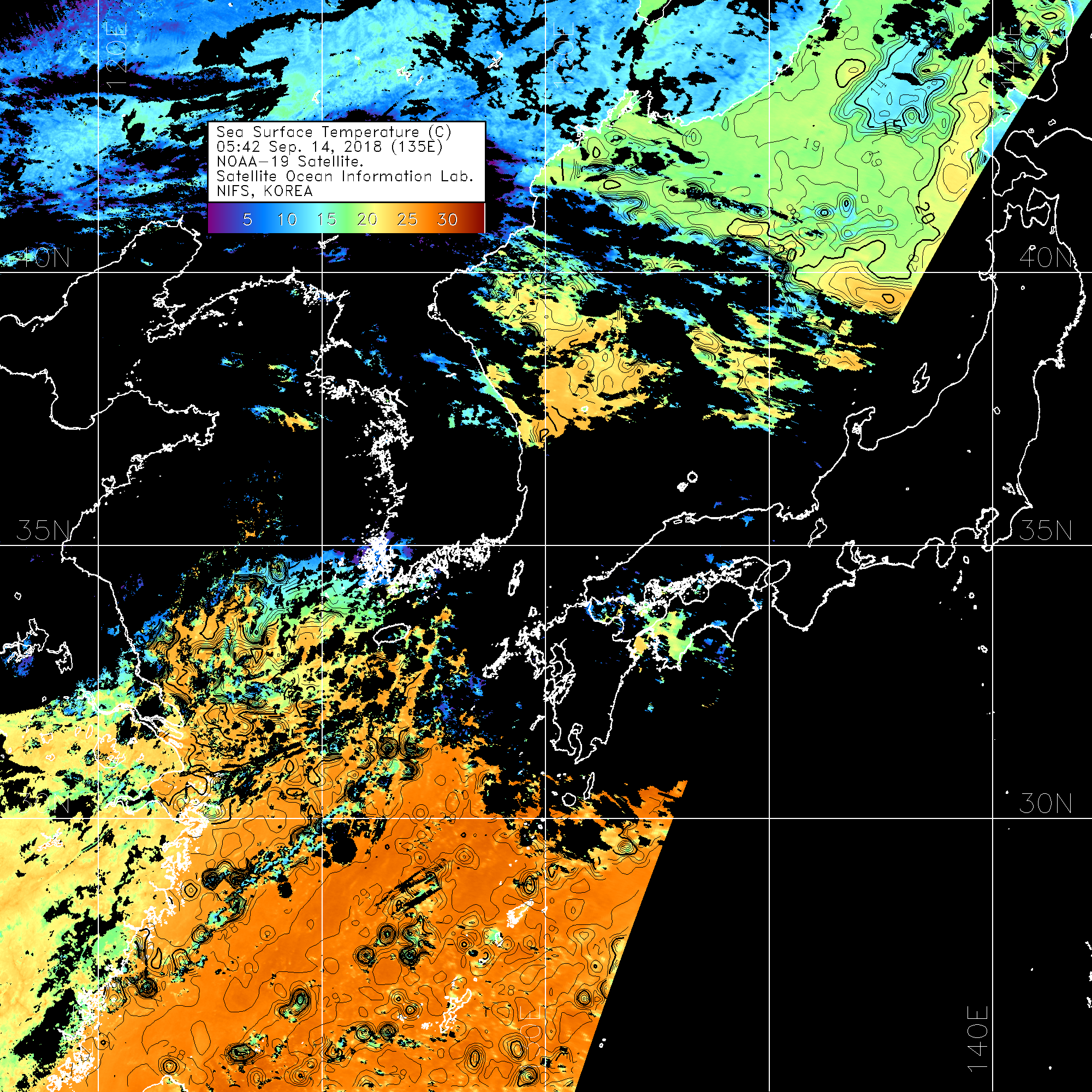 2018 년 09 월 14 일 NOAA 위성영상입니다. o 영상 시간 및 수온분포는 범례를 참고하시기 바랍니다. o 검은색은 구름을 나타냅니다. o 그림을 클릭하시면 크게 보실 수 있습니다.