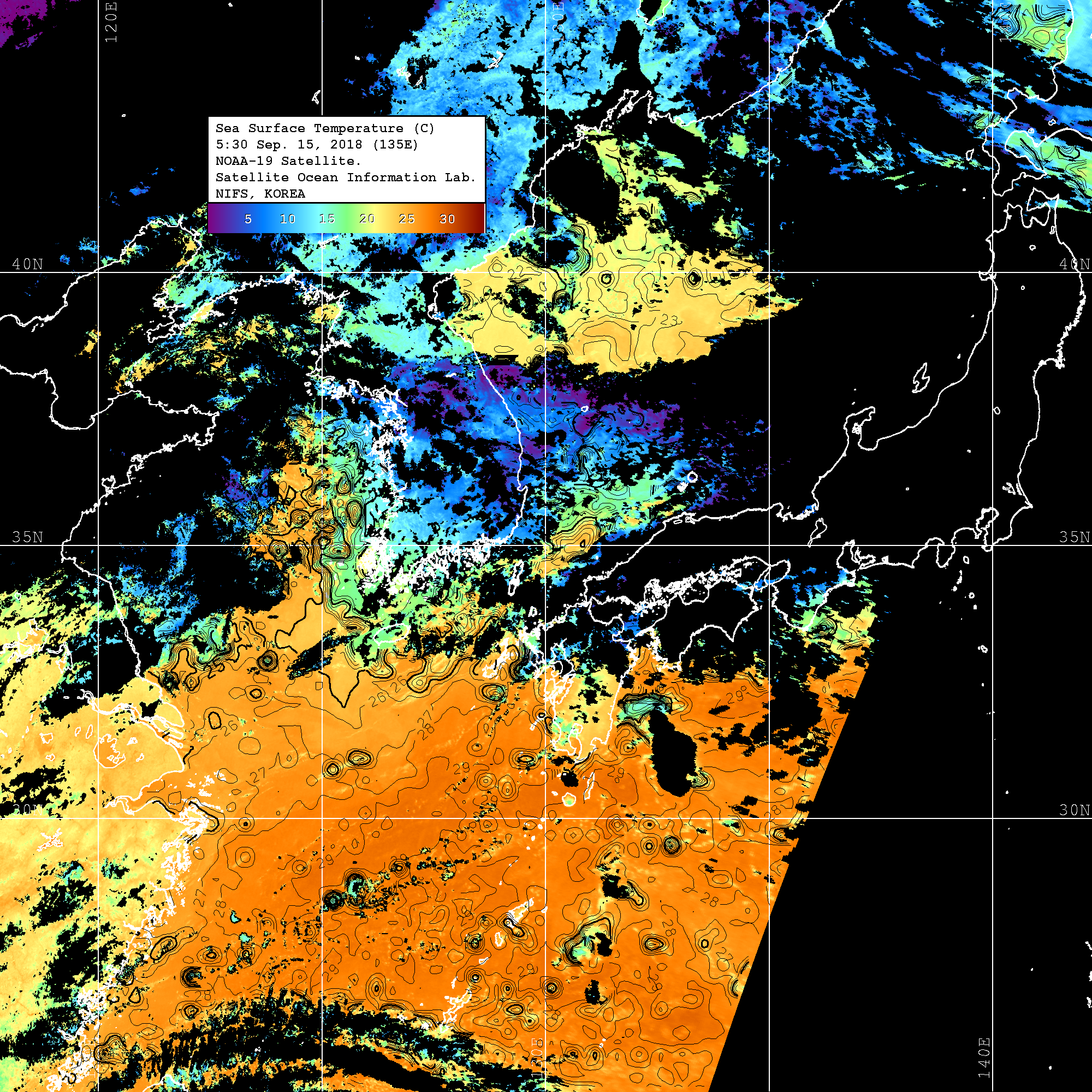 2018 년 09 월 15 일 NOAA 위성영상입니다. o 영상 시간 및 수온분포는 범례를 참고하시기 바랍니다. o 검은색은 구름을 나타냅니다. o 그림을 클릭하시면 크게 보실 수 있습니다.