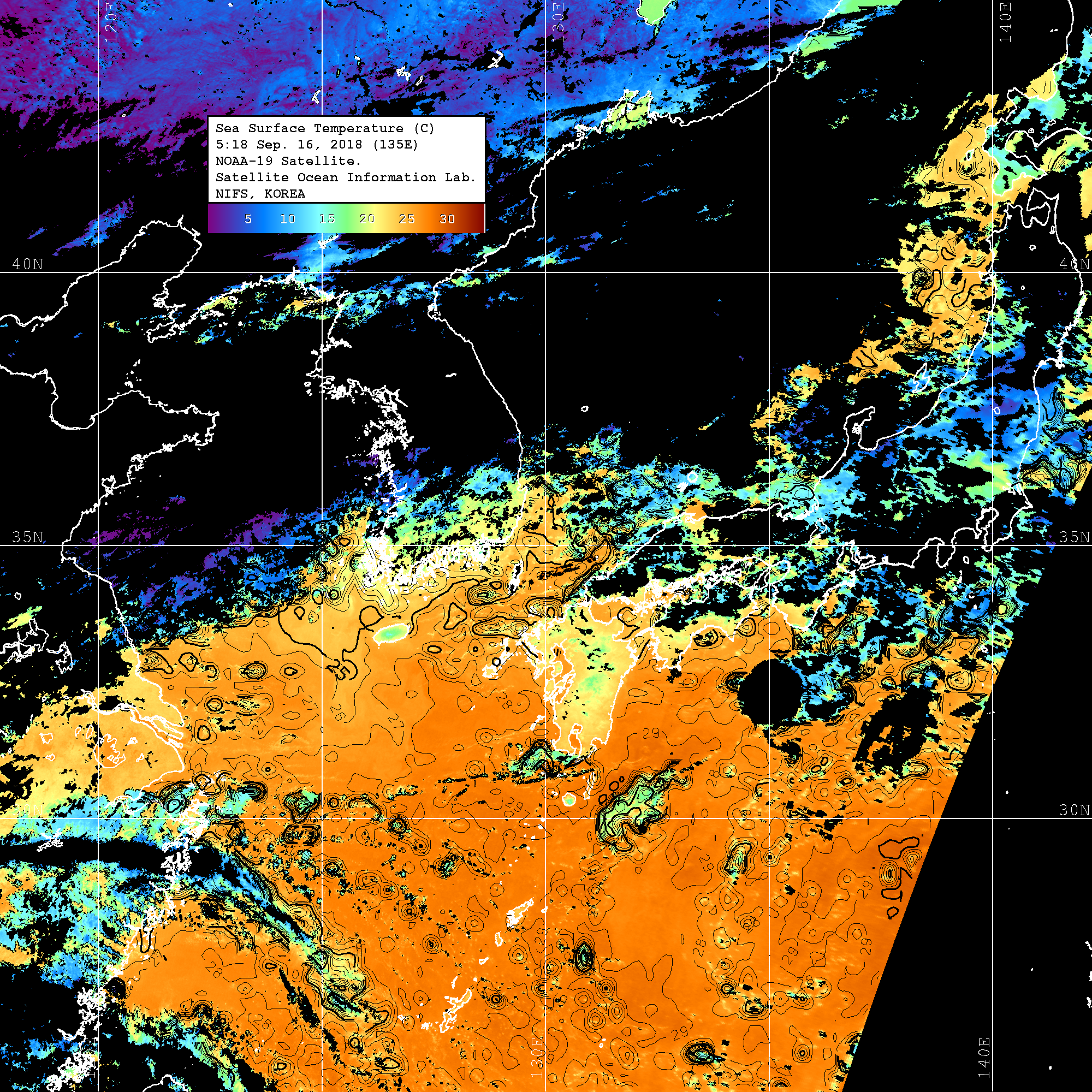 2018 년 09 월 16 일 NOAA 위성영상입니다. o 영상 시간 및 수온분포는 범례를 참고하시기 바랍니다. o 검은색은 구름을 나타냅니다. o 그림을 클릭하시면 크게 보실 수 있습니다.