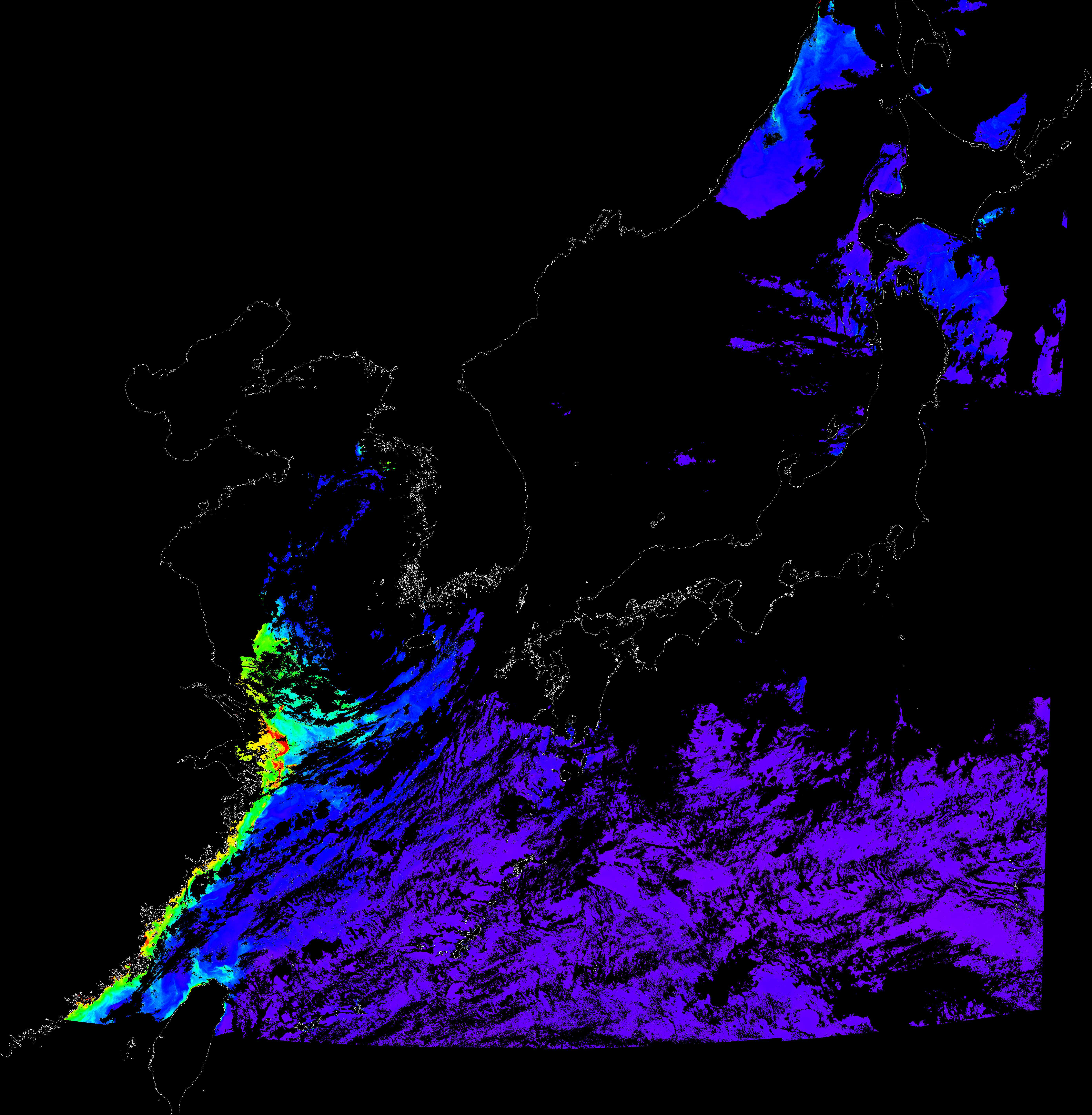 o 2018년 09월 14일 천리안 GOCI 클로로필 a 위성영상입니다. [ GOCI : Geostationary Ocean Color Imager ] o 농도분포는 하단 범례를 참고하시기 바랍니다. o 검은색은 구름을 나타냅니다.