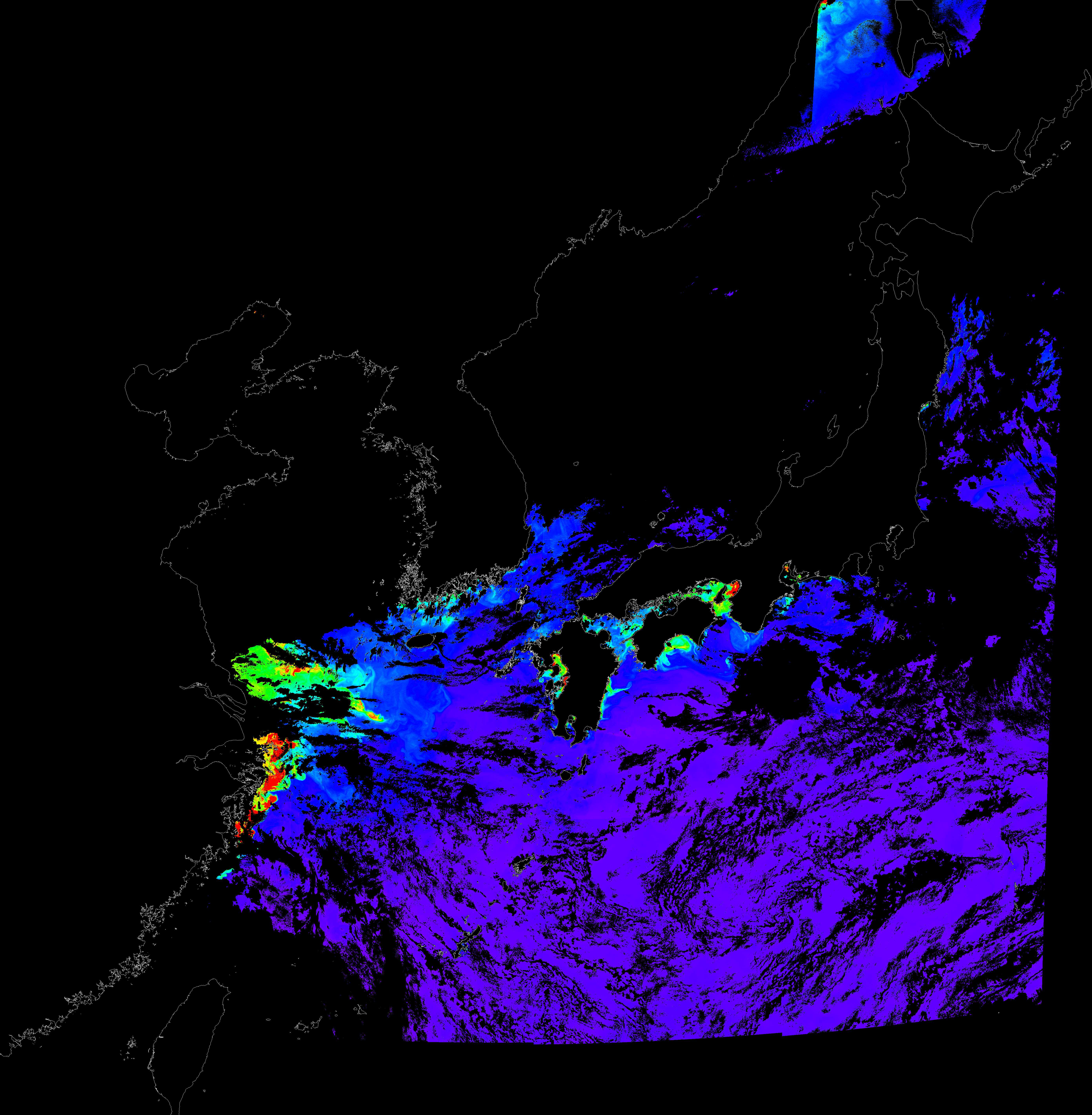 o 2018년 09월 16일 천리안 GOCI 클로로필 a 위성영상입니다. [ GOCI : Geostationary Ocean Color Imager ] o 농도분포는 하단 범례를 참고하시기 바랍니다. o 검은색은 구름을 나타냅니다.