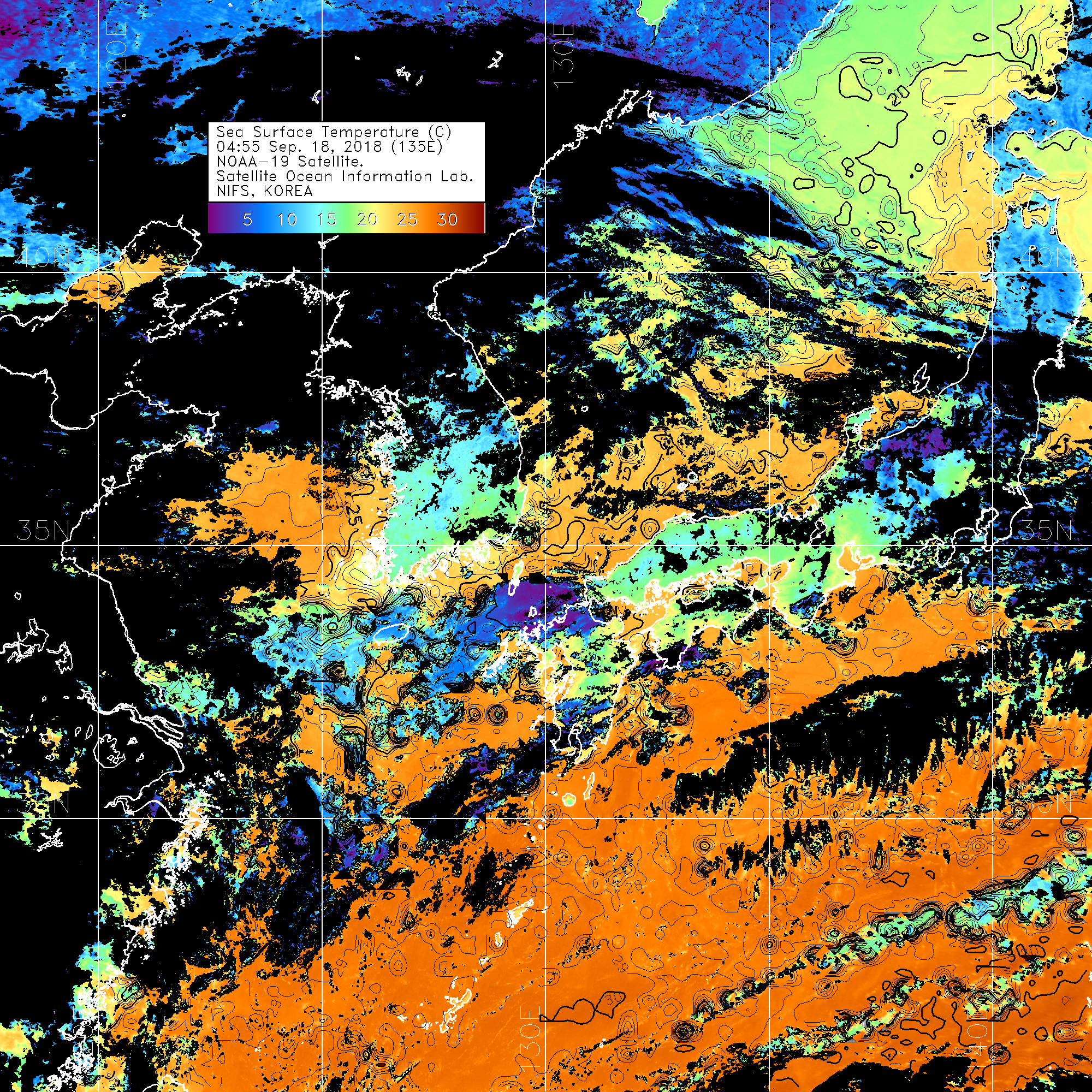 2018 년 09 월 18 일 NOAA 위성영상입니다. o 영상 시간 및 수온분포는 범례를 참고하시기 바랍니다. o 검은색은 구름을 나타냅니다. o 그림을 클릭하시면 크게 보실 수 있습니다.
