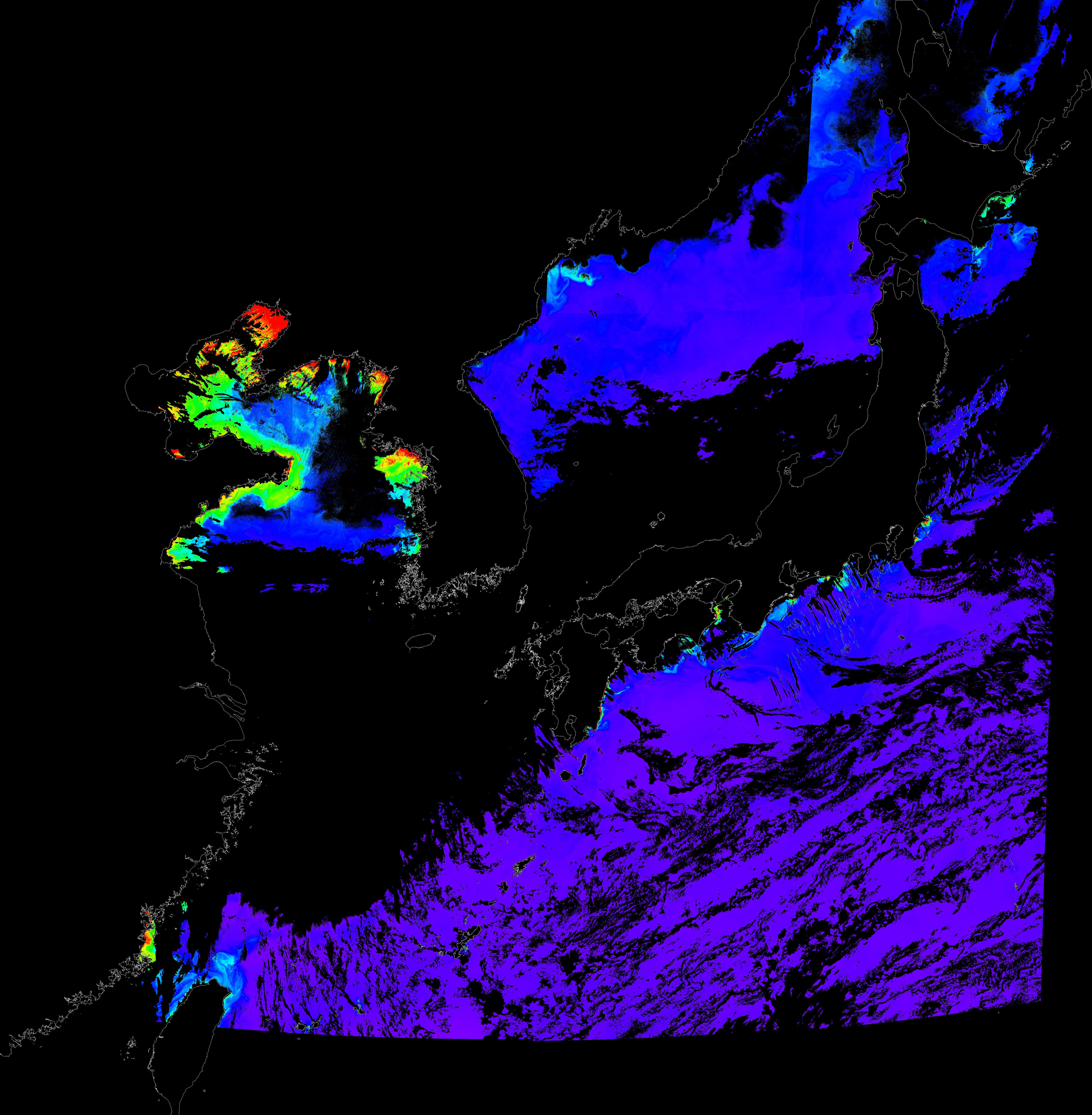 o 2018년 09월 17일 천리안 GOCI 클로로필 a 위성영상입니다. [ GOCI : Geostationary Ocean Color Imager ] o 농도분포는 하단 범례를 참고하시기 바랍니다. o 검은색은 구름을 나타냅니다.