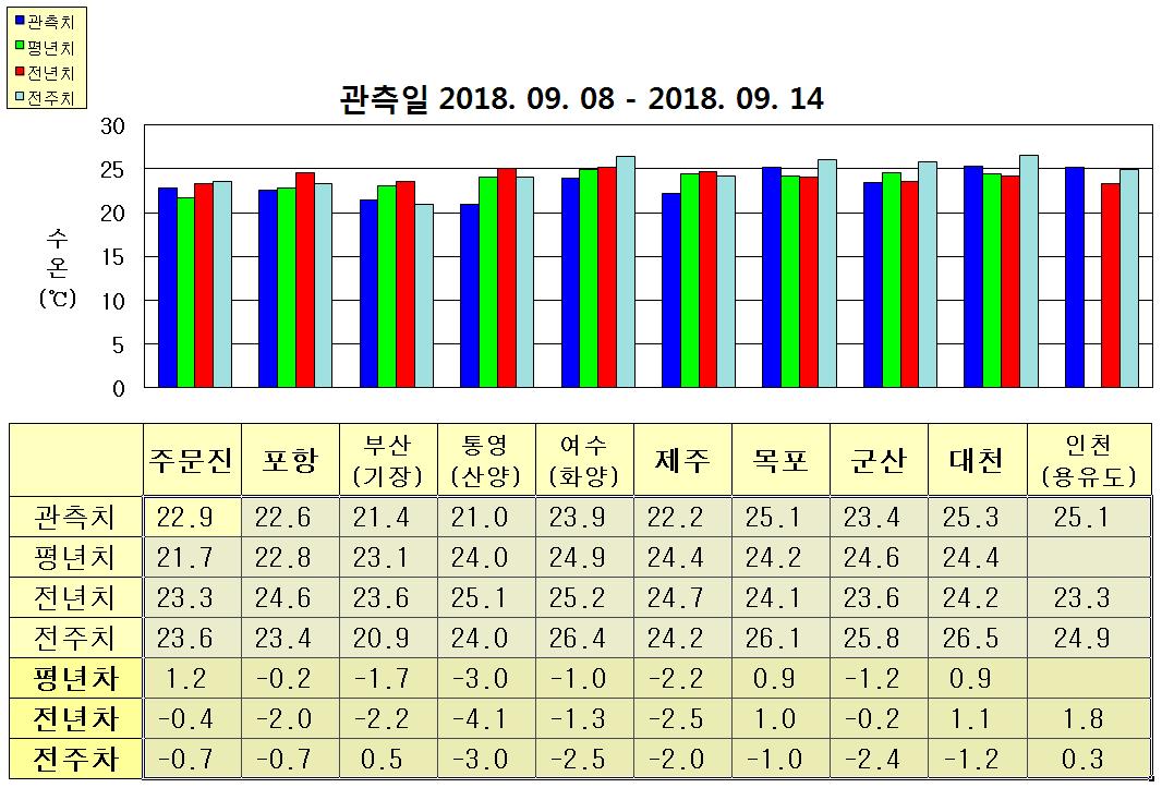 ○ 금주(2018. 09. 08 ~ 2018. 09. 14)의 한반도 연안 표면수온은 동해 연안역에서 섭씨 21.5~23.0도, 남해 연안역 21~24도, 서해 연안역에서 23.5~25.5도로 나타납니다. ○ 평년에 비해 주문진 1.2도 높음, 포항 비슷함을 제외한 동해 연안역은 1.5~2.0도 낮게, 남해 연안역은 1~3도 낮게, 군산 1.2도 낮음을 제외한 서해 연안역은 0.5~1.0도 높게 나타납니다. ○ 전년에 비해 동해 연안역은 0.5~2.0도 낮게, 남해 연안역은 1.5~4.0도 낮게, 군산 비슷함을 제외한 서해 연안역은 1~2도 높게 나타납니다.