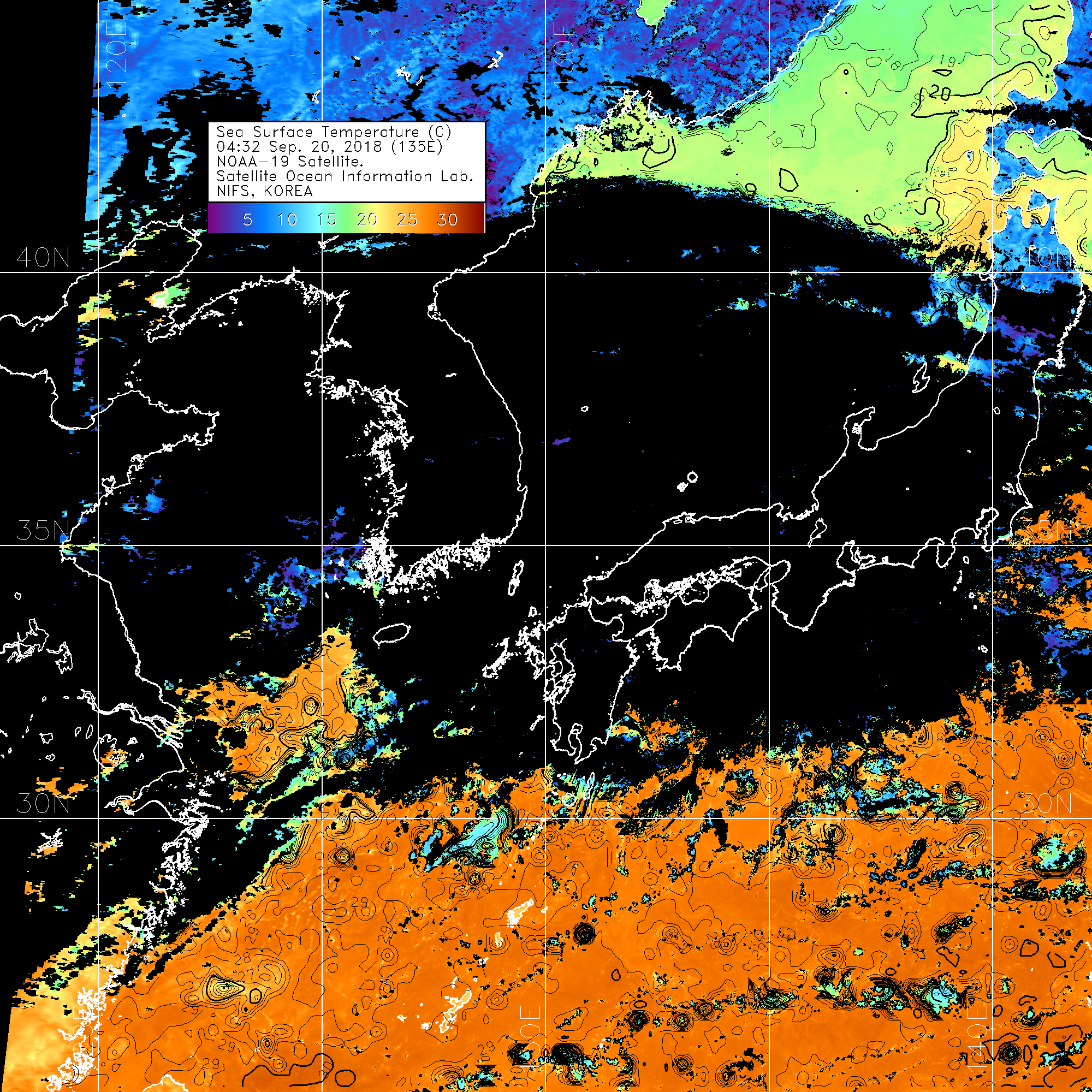 2018 년 09 월 20 일 NOAA 위성영상입니다. o 영상 시간 및 수온분포는 범례를 참고하시기 바랍니다. o 검은색은 구름을 나타냅니다. o 그림을 클릭하시면 크게 보실 수 있습니다.