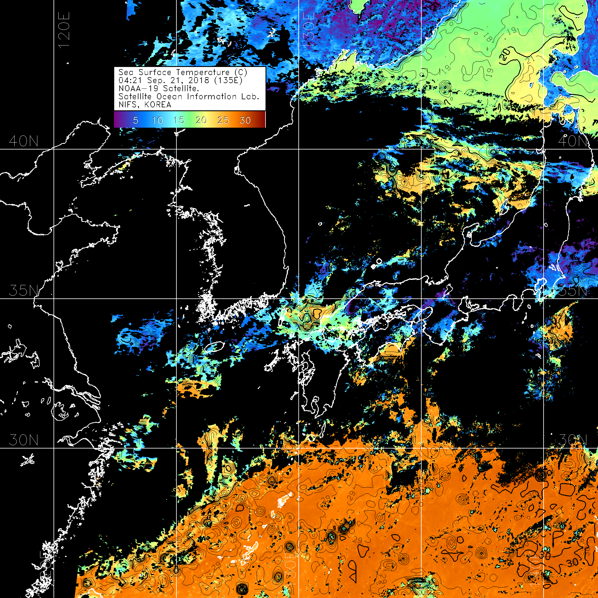 2018 년 09 월 21 일 NOAA 위성영상입니다. o 영상 시간 및 수온분포는 범례를 참고하시기 바랍니다. o 검은색은 구름을 나타냅니다. o 그림을 클릭하시면 크게 보실 수 있습니다.