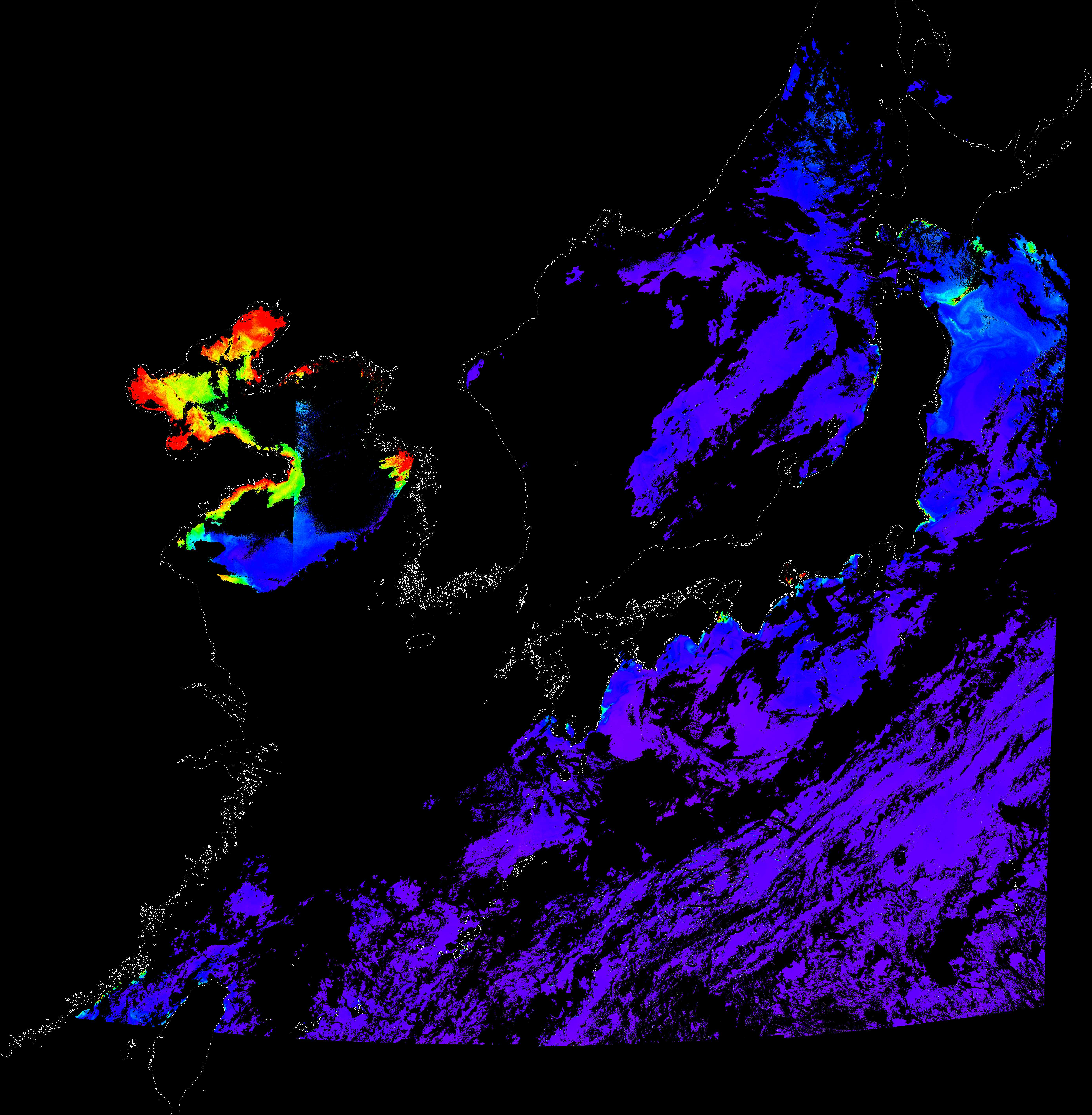 o 2018년 09월 23일 천리안 GOCI 클로로필 a 위성영상입니다. [ GOCI : Geostationary Ocean Color Imager ] o 농도분포는 하단 범례를 참고하시기 바랍니다. o 검은색은 구름을 나타냅니다.
