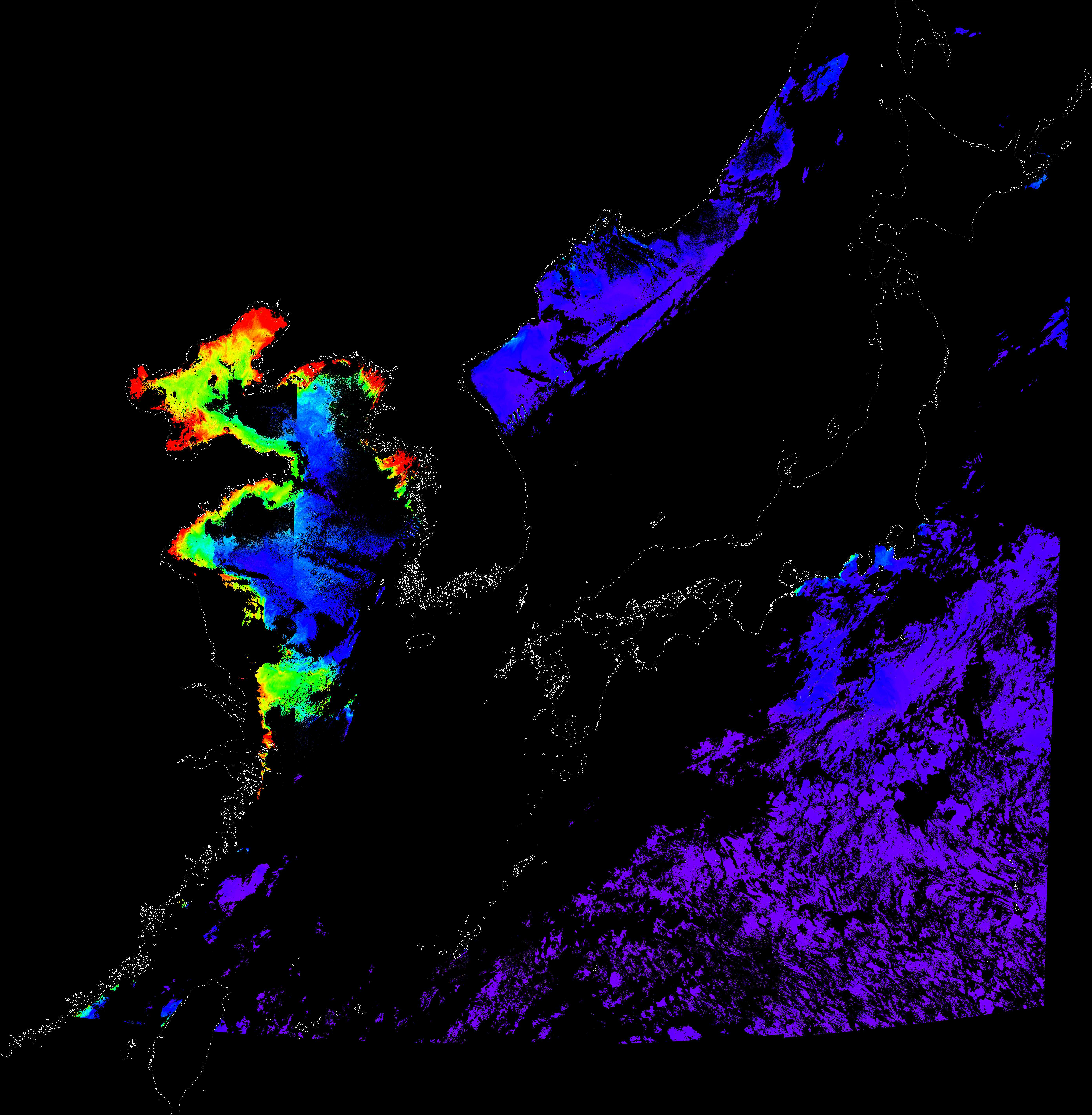 o 2018년 09월 24일 천리안 GOCI 클로로필 a 위성영상입니다. [ GOCI : Geostationary Ocean Color Imager ] o 농도분포는 하단 범례를 참고하시기 바랍니다. o 검은색은 구름을 나타냅니다.