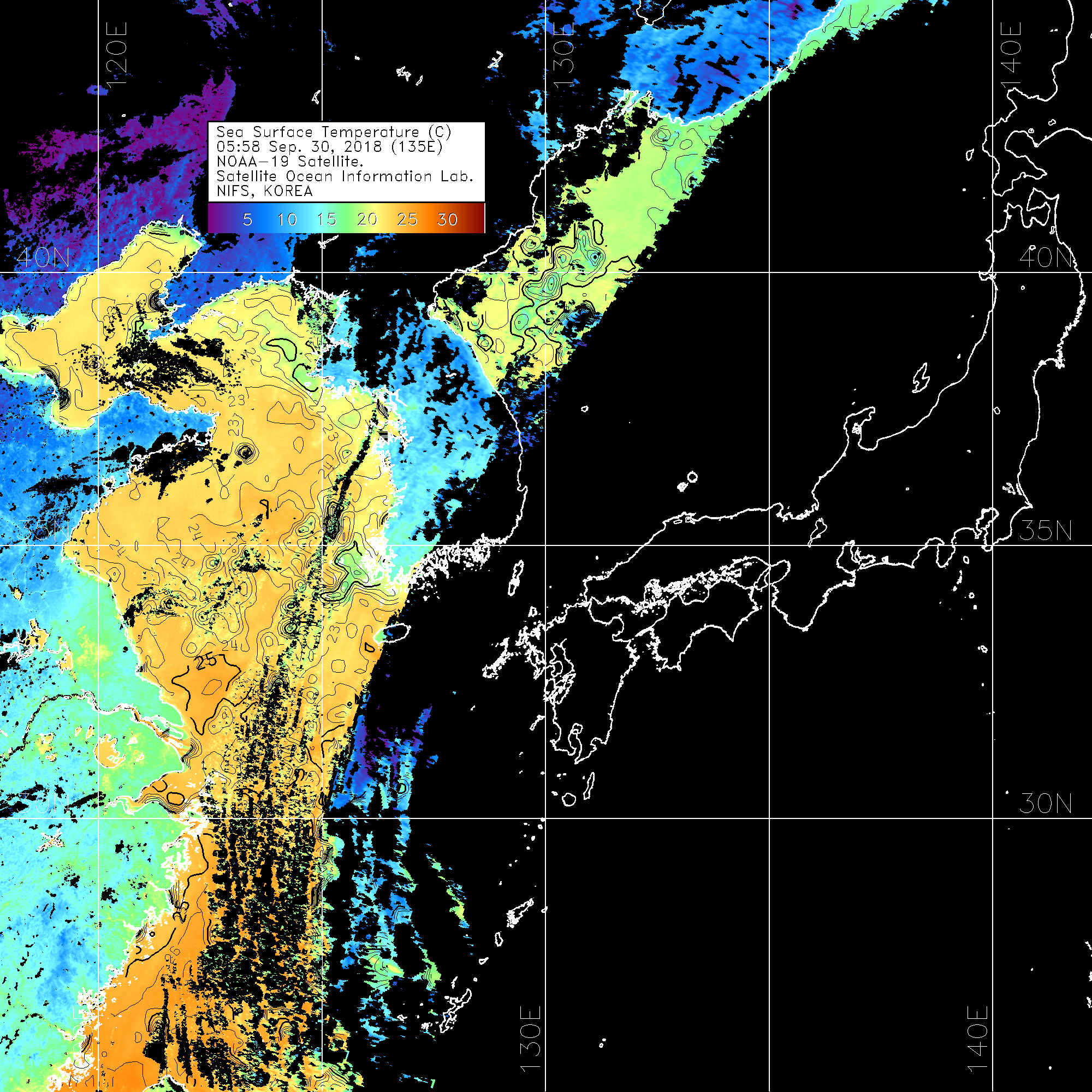o 2018 년 09 월 30 일 NOAA 위성영상입니다. o 영상 시간 및 수온분포는 범례를 참고하시기 바랍니다. o 검은색은 구름을 나타냅니다. o 그림을 클릭하시면 크게 보실 수 있습니다.