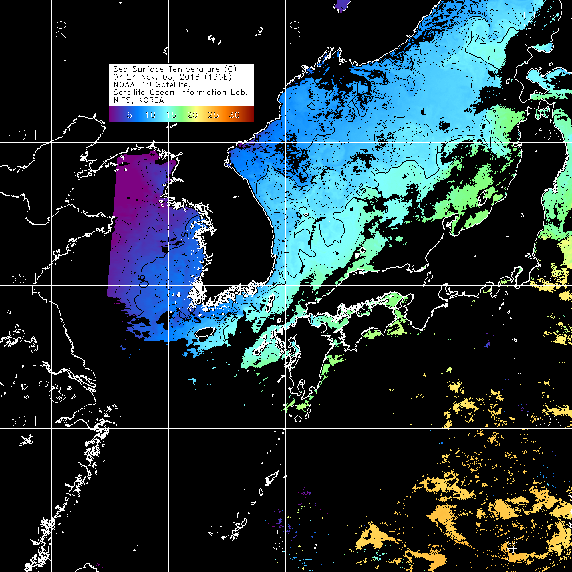 o 2018 년 11 월 03 일 NOAA 위성영상입니다. o 영상 시간 및 수온분포는 범례를 참고하시기 바랍니다. o 검은색은 구름을 나타냅니다. o 그림을 클릭하시면 크게 보실 수 있습니다.