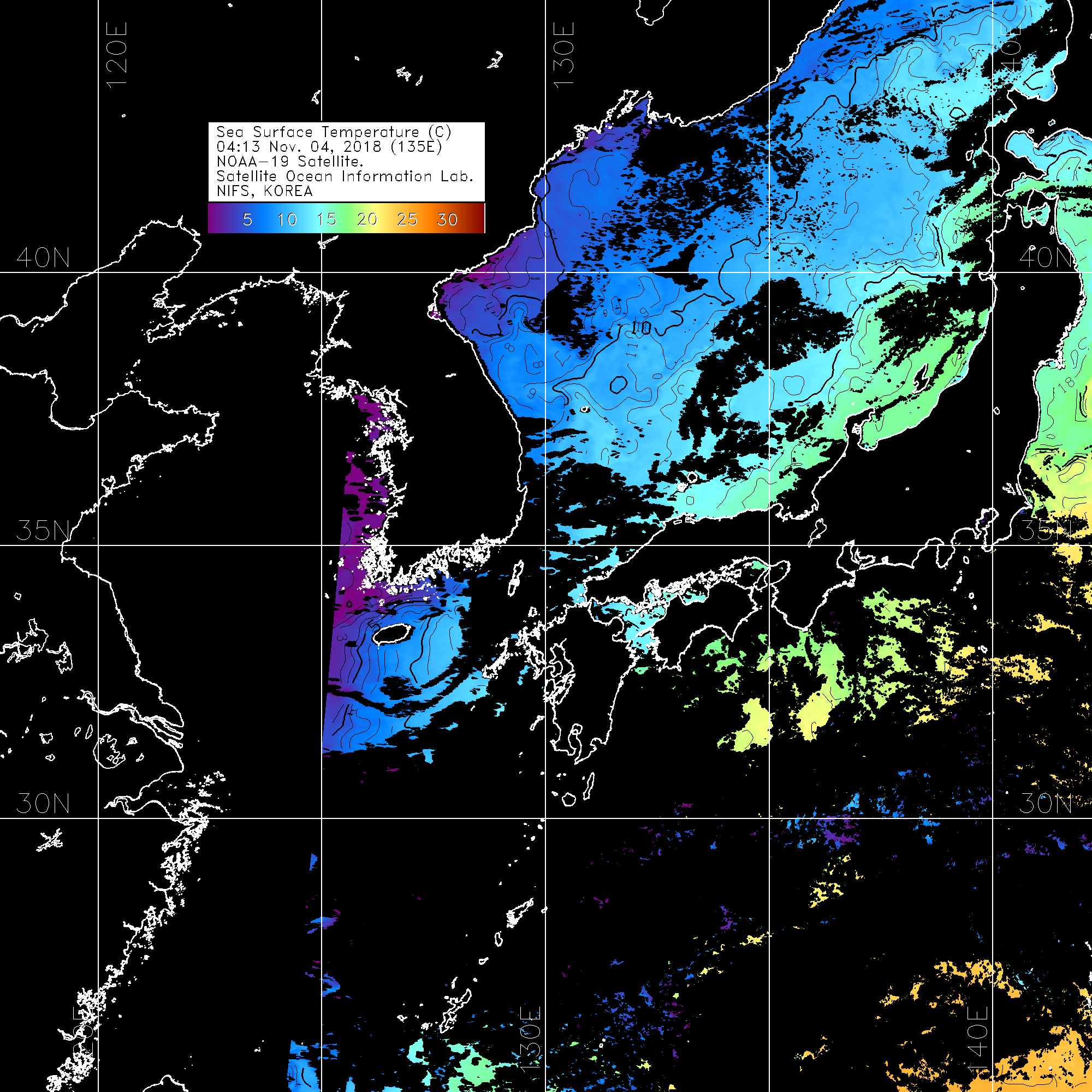 o 2018 년 11 월 04 일 NOAA 위성영상입니다. o 영상 시간 및 수온분포는 범례를 참고하시기 바랍니다. o 검은색은 구름을 나타냅니다. o 그림을 클릭하시면 크게 보실 수 있습니다.
