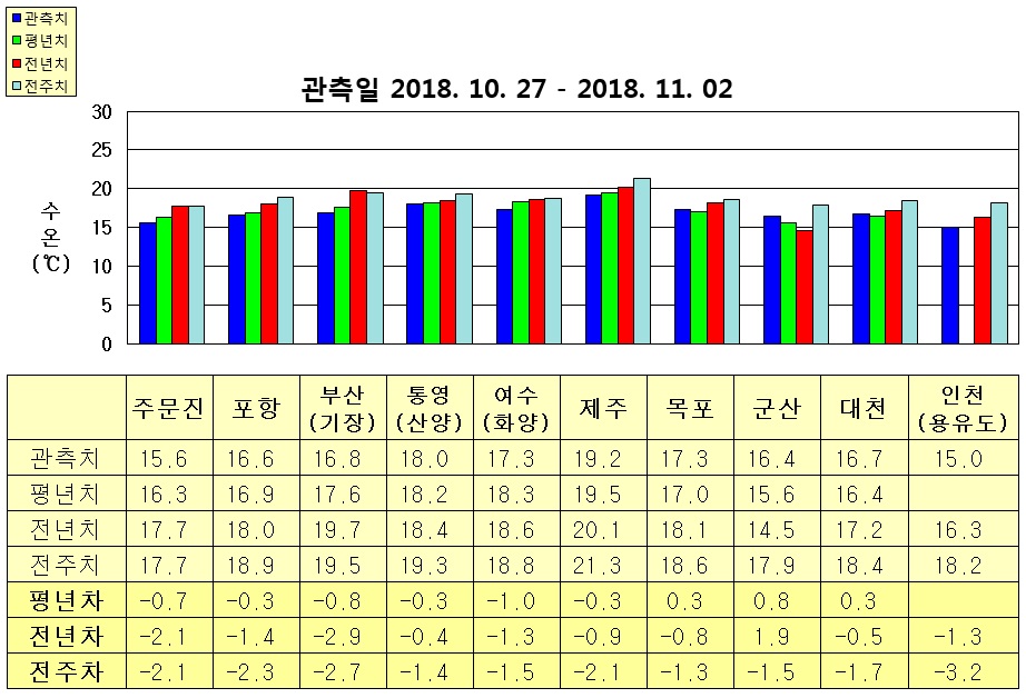 ○ 금주(2018. 10. 27 ~ 2018. 11. 02)의 한반도 연안 표면수온은 동해 연안역에서 섭씨 15.5~17.0도, 남해 연안역 17.0~19.5도, 서해 연안역에서 15.0~17.5도로 나타납니다. ○ 평년에 비해 포항 비슷하게 나타나며 그 외 동해 연안역은 0.5~1.0도 낮게, 여수 1도 낮게 나타나며 그 외 남해 연안역은 비슷하게, 군산 0.8도 높게 나타나며 그 외 서해 연안역은 비슷하게 나타납니다. ○ 전년에 비해 동해 연안역은 1.5~3.0도 낮게, 남해 연안역은 0.5~1.5도 낮게, 군산 1.9도 높게 나타나며 그 외 서해 연안역은 0.5~1.5도 낮게 나타납니다.