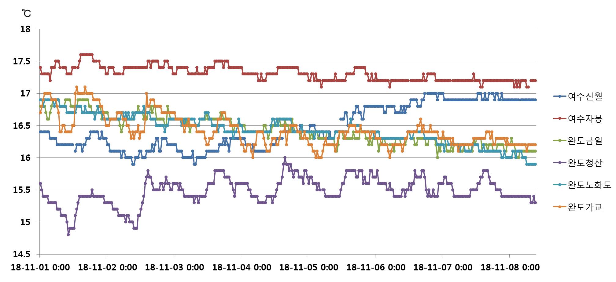 o 국립수산과학원의 실시간 해양환경 어장정보시스템 관측 자료 분석 결과, 남해 (여수신월, 여수자봉, 완도금일, 완도청산, 완도노화도, 완도가교)에서 11월1일 00시∼11월 8일 09시 현재 수온 변화 경향은 아래와 같습니다. o 11월 8일 09시 현재 표층 수온은 여수신월 16.9℃, 여수자봉 17.2℃, 완도금일 16.1℃, 완도청산 15.3℃, 완도노화도 15.9℃, 완도가교 16.2℃를 보였습니다. o 관측기간 동안 남해(통영, 거제, 남해)연안 수온은 대체로 15.0~17.5℃의 분포를 보였으며, 관측정점별 수온편차는 0.5∼1.5℃ 내외로 나타나 급격한 수온 변동은 보이지 않았습니다. o 그러나 한파 등에 따라 수온 변동이 발생할 수 있으니 국립수산과학원 실시간 해양환경 어장정보시스템에서 제공하는 수온정보를 적극적으로 활용하여 수온 변동 경향을 주시해 주시기 바랍니다.