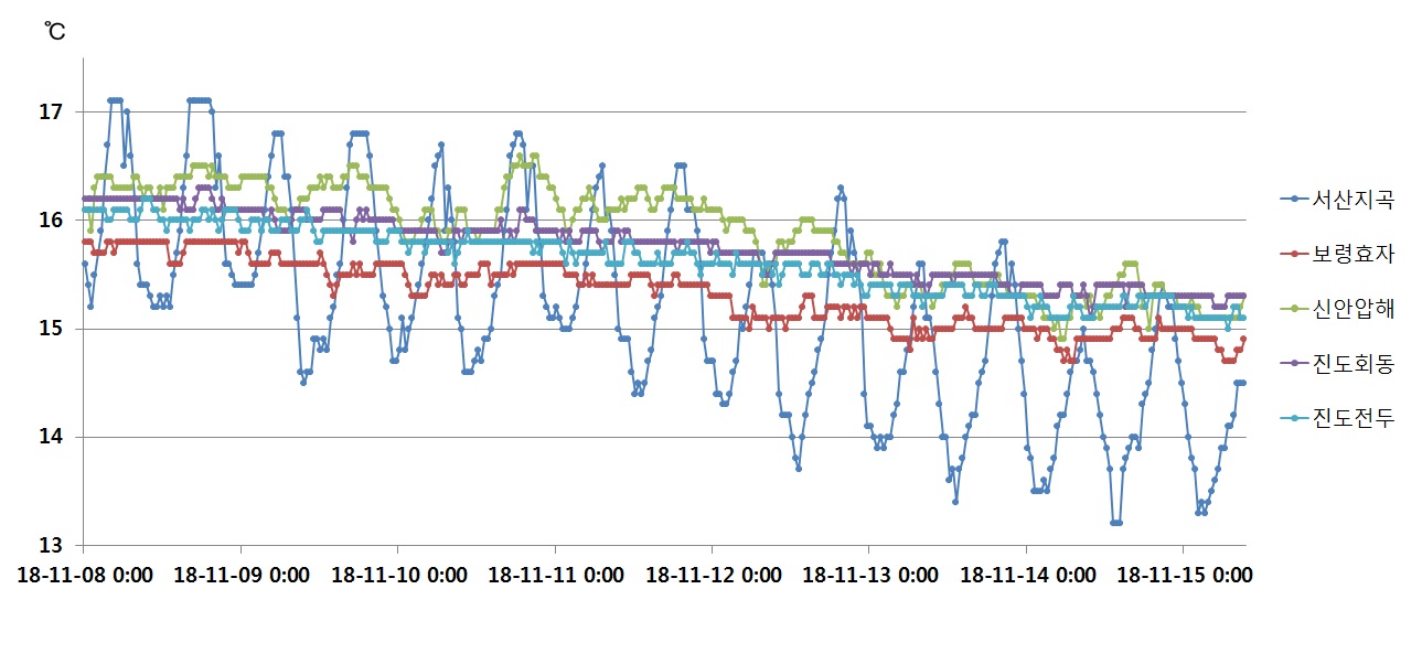 o 국립수산과학원의 실시간 해양환경 어장정보시스템 관측 자료 분석 결과, 남해 (서산지곡, 보령효자도, 신안압해, 진도회동, 진도전두)에서 11월8일 00시∼11월 15일 09시 현재 수온 변화 경향은 아래와 같습니다.