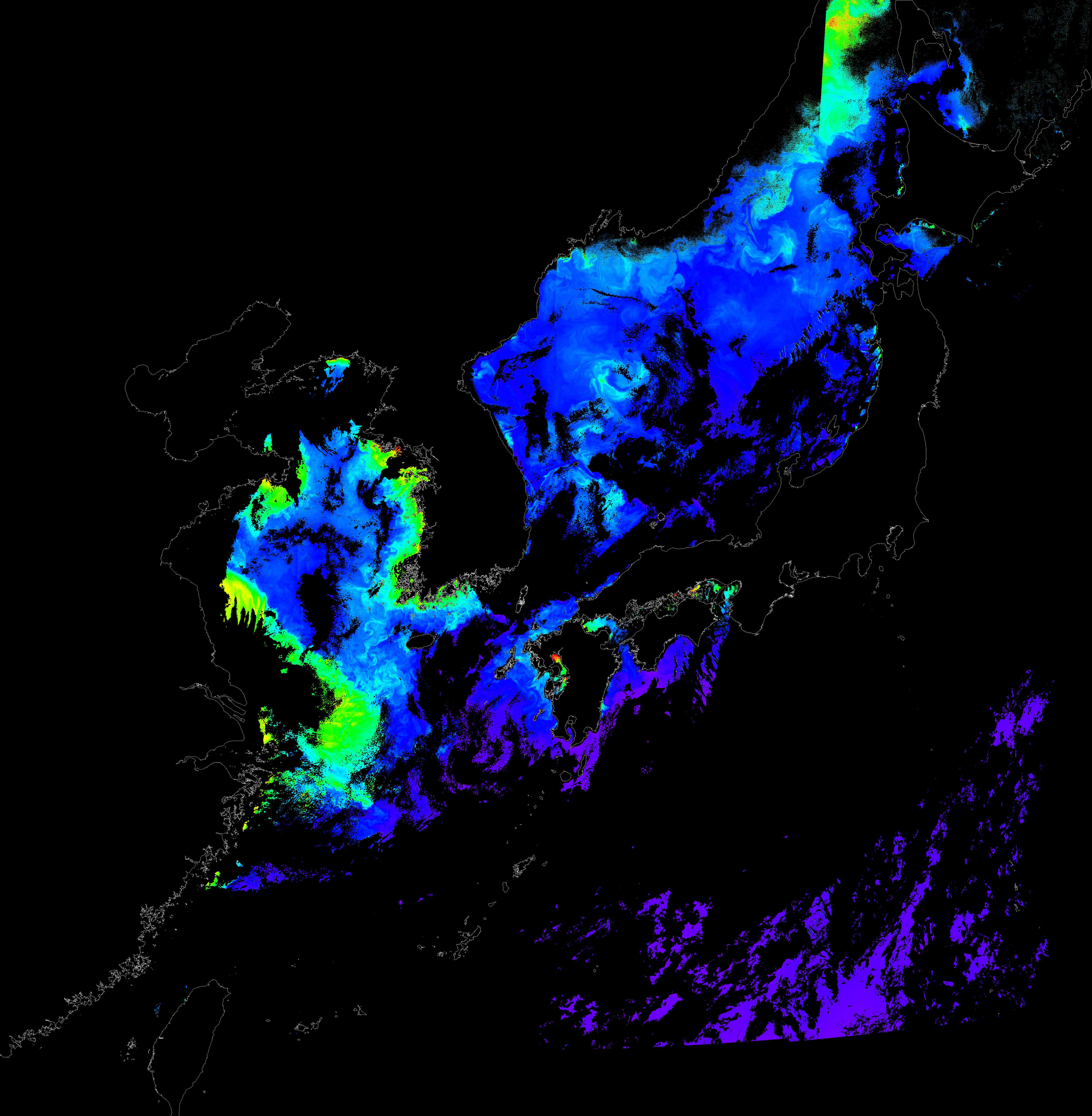 o 2018년 10월 13일 천리안 GOCI 클로로필 a 위성영상입니다. [ GOCI : Geostationary Ocean Color Imager ] o 농도분포는 하단 범례를 참고하시기 바랍니다. o 검은색은 구름을 나타냅니다.