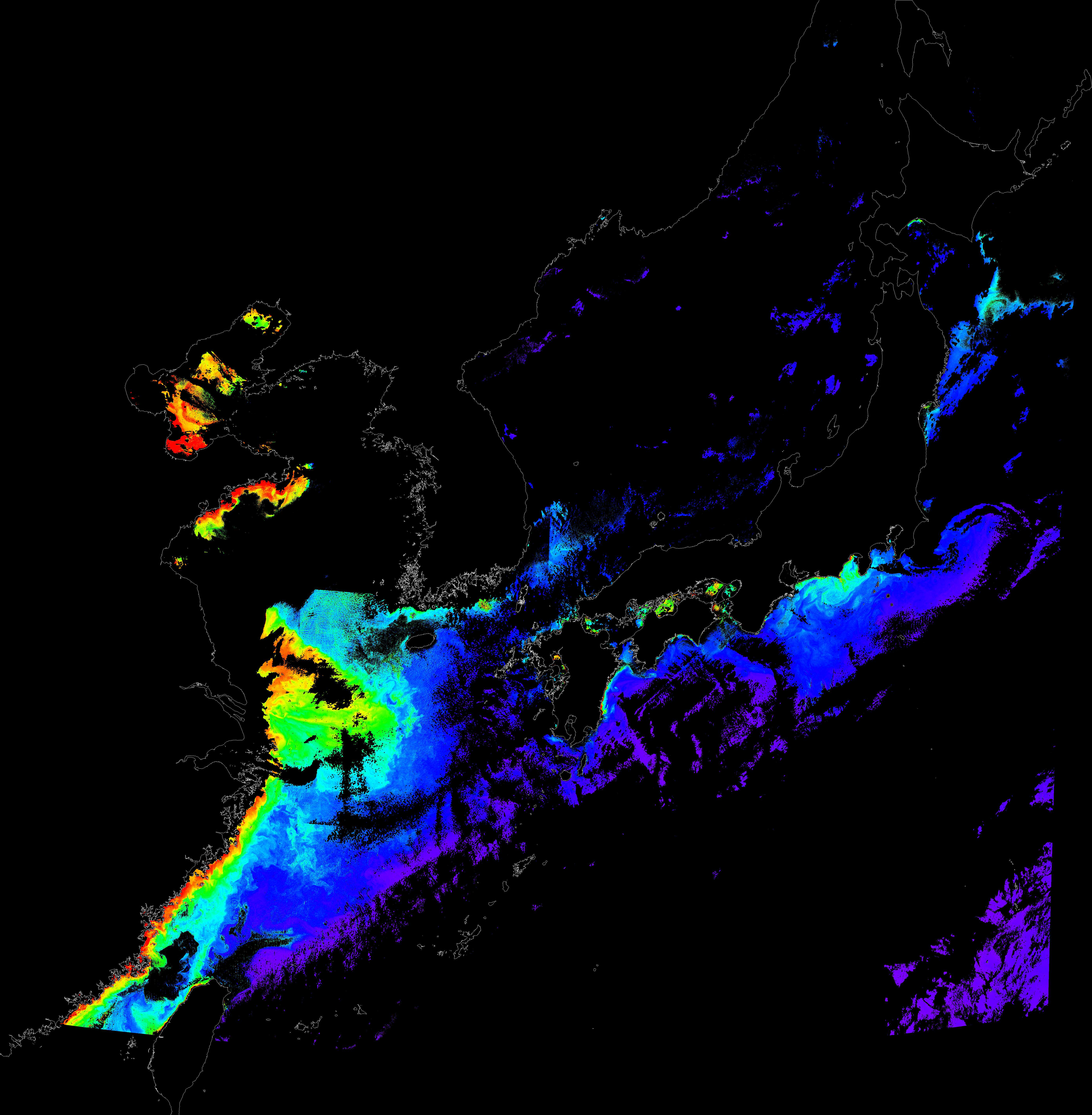o 2018년 10월 28일 천리안 GOCI 클로로필 a 위성영상입니다. [ GOCI : Geostationary Ocean Color Imager ] o 농도분포는 하단 범례를 참고하시기 바랍니다. o 검은색은 구름을 나타냅니다.