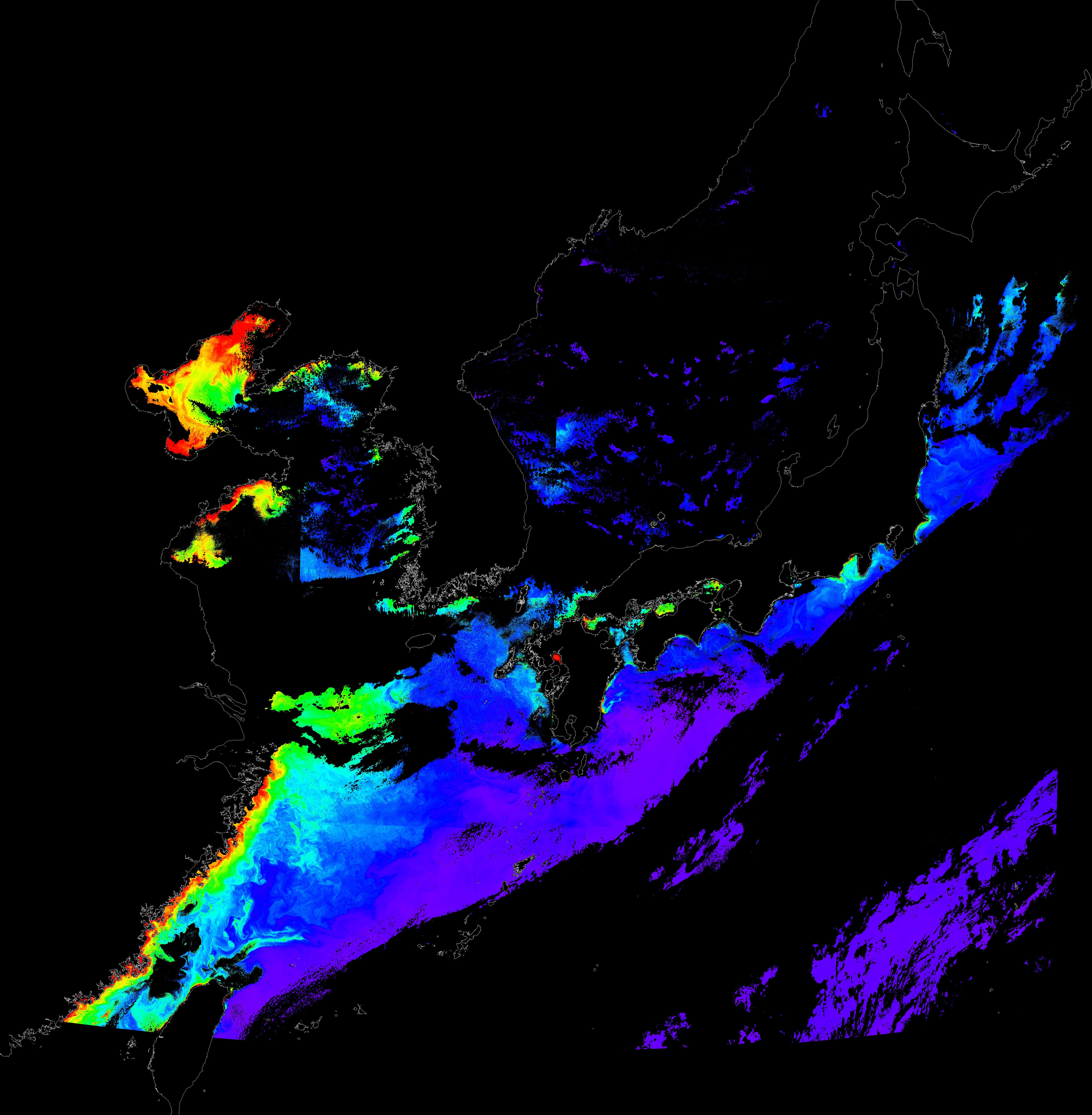 o 2018년 10월 29일 천리안 GOCI 클로로필 a 위성영상입니다. [ GOCI : Geostationary Ocean Color Imager ] o 농도분포는 하단 범례를 참고하시기 바랍니다. o 검은색은 구름을 나타냅니다.