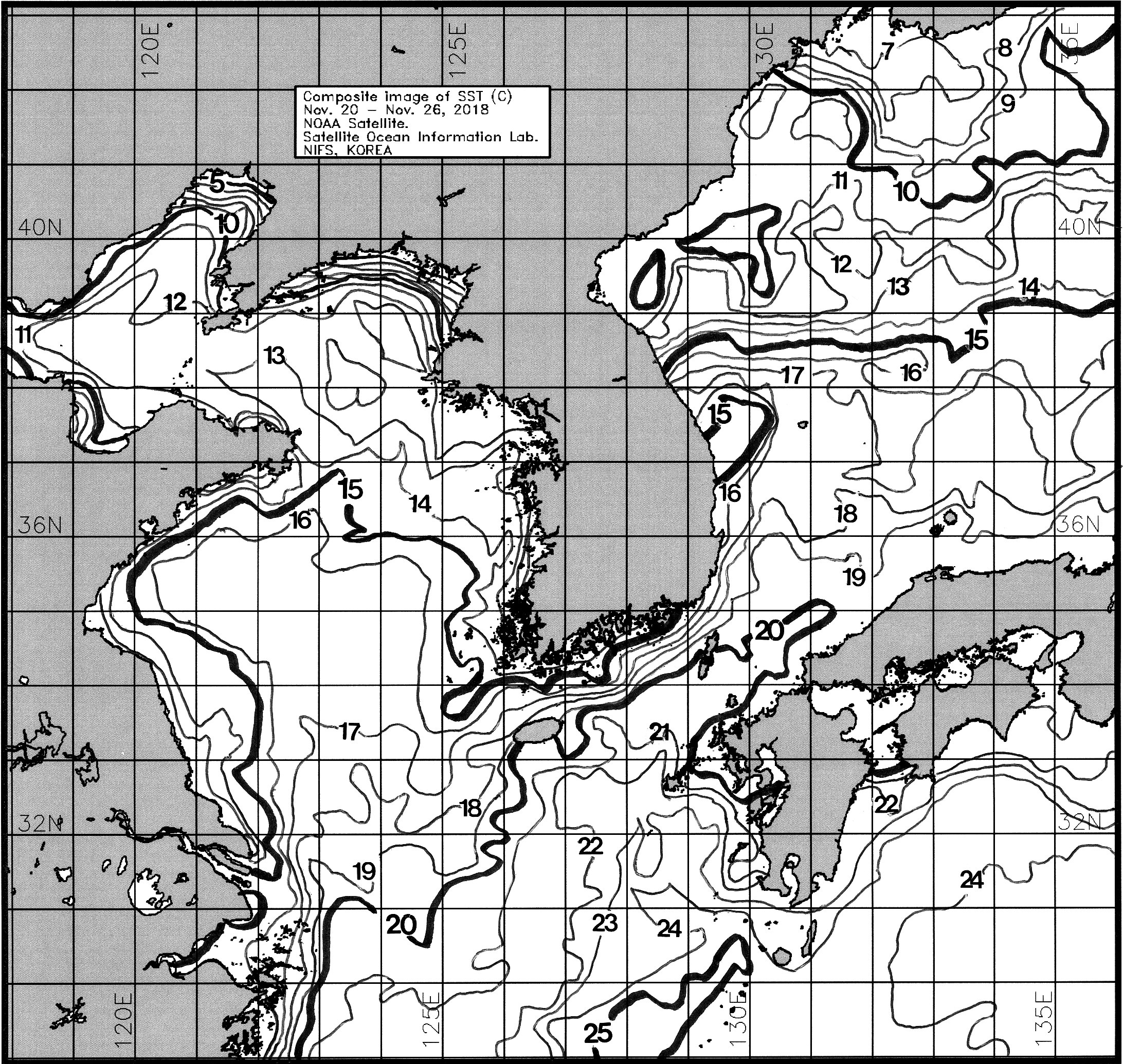 ○ 금주(2018. 11. 20 ~ 2018. 11. 26)의 한국근해 표면수온은 대화퇴 근해 13~14도, 울릉도-독도 근해 17~18도, 대마도 근해 19~21도, 제주도 근해 19~20도, 이어도 근해 18~19도, 가거초 근해 15~16도, 어청도 근해 13~15도, 백령도 근해 12∼13도 로 나타납니다. ○ 「평년에 비해」대화퇴 근해 비슷하게, 울릉도-독도 근해 0.5도 높게, 대마도 근해 비슷하게, 제주도 근해 0.5도 낮게, 이어도 근해 비슷하게, 가거초 근해 0.5도 높게, 어청도 근해 0.5도 높게 나타납니다. ○ 「전년에 비해」대화퇴 근해 2도 높게, 울릉도-독도 근해 2도 높게, 대마도 근해 비슷하게, 제주도 근해 0.5도 낮게, 이어도 근해 1도 높게, 가거초 근해 3도 높게, 어청도 근해 2.5도 높게, 백령도 근해 2도 높게 나타납니다.