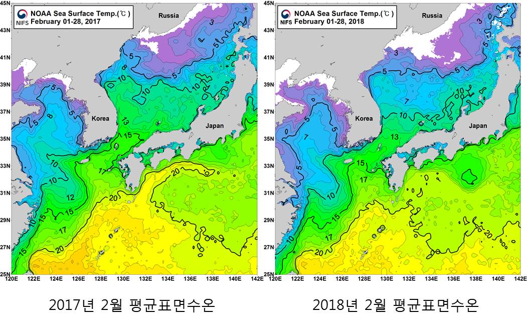o 국립수산과학원 위성해양 정보실에서 수신한 NOAA위성 관측 표면수온 자료를 분석한 2017년 2월 평균표면수온(좌), 2018년 2월 평균표면수온(우)입니다. o 한국근해 2017년 2월 평균 표면수온은 동해 11∼15℃, 남해 8∼17℃, 서해 4∼9℃의 분포를 보이며, 2018년 2월 평균 표면수온은 동해 7∼12℃, 남해 5∼15℃, 서해 5∼9℃로 나타납니다. o 전년에 비해 2월 평균 표면수온은 동해 2∼4℃ 낮게, 남해 2∼3℃ 낮게, 서해 1℃ 낮게 나타나며, 전년에 비해 동·서·남해 모두 낮은 분포를 보입니다.