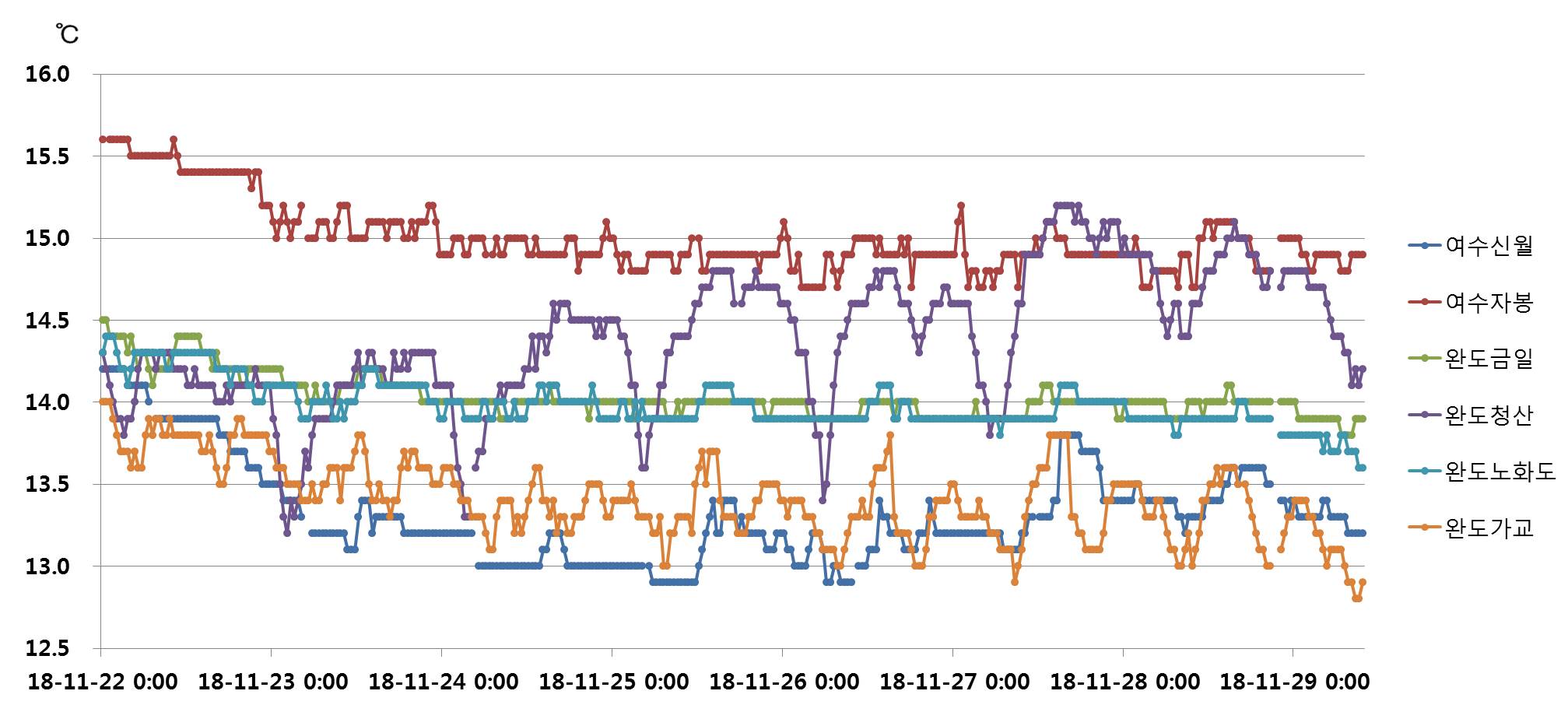 ○ 국립수산과학원의 실시간 해양환경 어장정보시스템 관측 자료 분석 결과, 남해 (여수신월, 여수자봉, 완도금일, 완도청산, 완도노화도, 완도가교)에서 11월22일 00시∼11월 29일 09시 현재 수온 변화 경향은 아래와 같습니다.