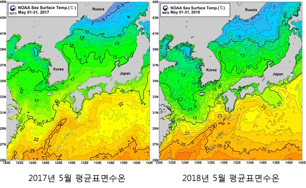 o 국립수산과학원 위성해양정보실에서 수신한 NOAA위성 관측 표면수온 자료를 분석한 2017년 5월 평균표면수온(좌), 2018년 5월 평균표면수온(우)입니다. o 한국근해 2017년 5월 평균 표면수온은 동해 14∼17℃, 남해 15∼18℃, 서해 11∼17℃ 의 분포를 보이며, 2018년 5월 평균 표면수온은 동해 12∼16℃, 남해 14∼17℃, 서해 10∼14℃로 나타납니다. o 전년에 비해 5월 평균 표면수온은 동해 1∼2℃ 낮게, 남해 1℃ 낮게, 서해 1∼2℃ 낮게 나타나, 전년에 비해 동·서·남해는 전체 적으로 낮은 분포를 보입니다. |