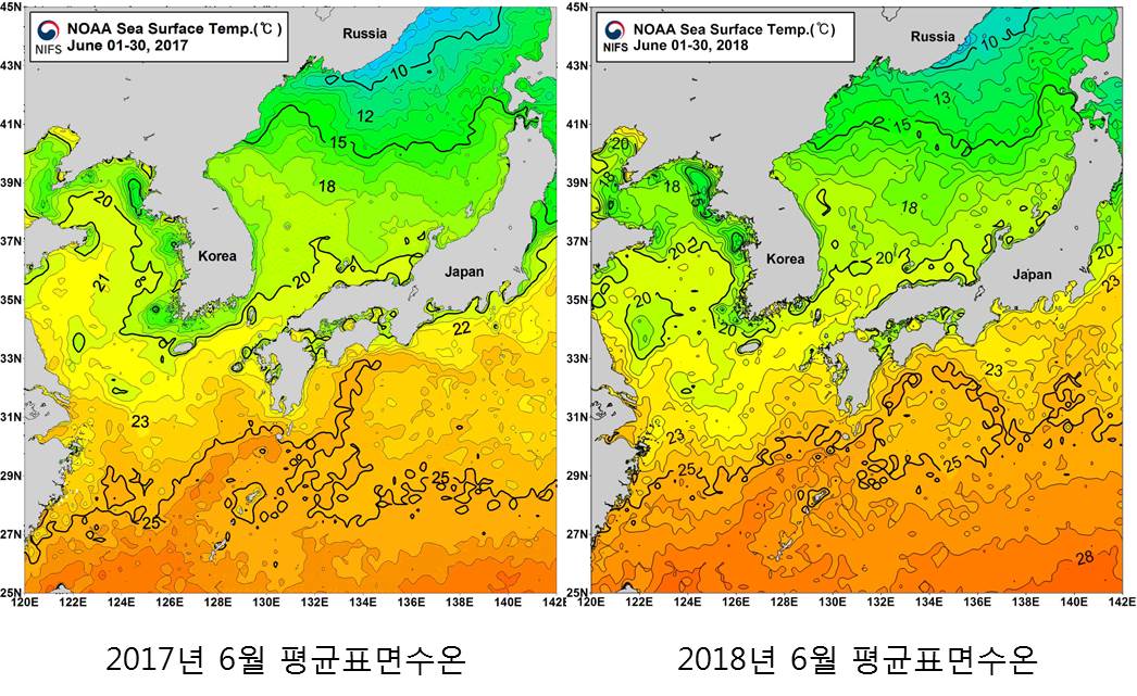 o 국립수산과학원 위성해양정보실에서 수신한 NOAA위성 관측 표면수온 자료를 분석한 2017년 6월 평균표면수온(좌), 2018년 6월 평균표면수온(우)입니다. o 한국근해 2017년 6월 평균 표면수온은 동해 17∼20℃, 남해 17∼20℃, 서해 15∼20℃ 의 분포를 보이며, 2018년 6월 평균 표면수온은 동해 18∼20℃, 남해 18∼21℃, 서해 15∼20℃로 나타납니다. o 전년에 비해 6월 평균 표면수온은 동해 0.5∼1.0℃ 높게, 남해 0.5∼1.5℃ 높게, 서해 비슷하거나 0.5∼1.0℃ 높게 나타나, 전년에 비해 동·서·남해 전체 적으로 높은 분포를 보이며, 서해의 경우는 중부연안의 경우 비슷한 분포를 보입니다.