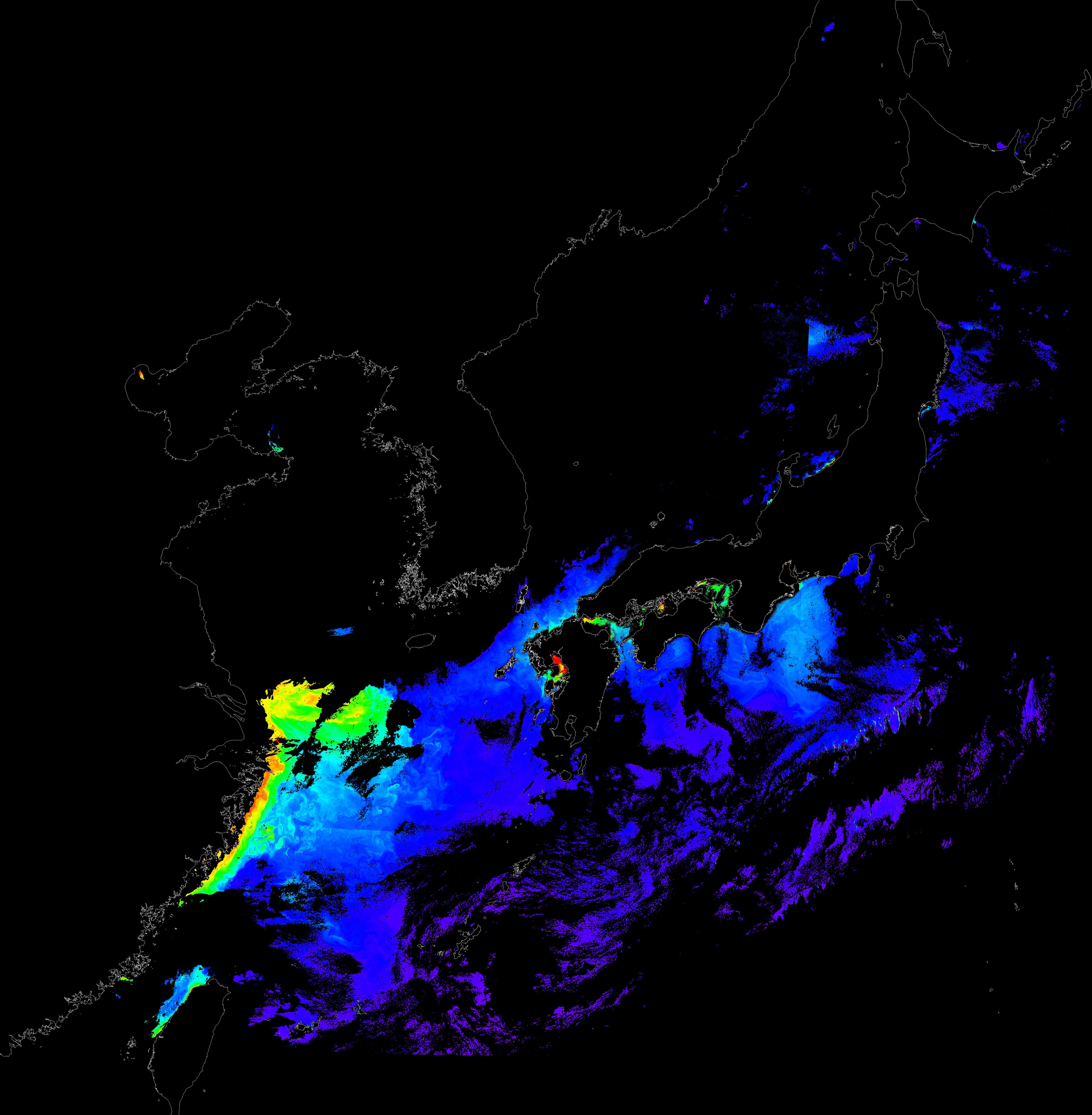 o 2018년 11월 24일 천리안 GOCI 클로로필 a 위성영상입니다. [ GOCI : Geostationary Ocean Color Imager ] o 농도분포는 하단 범례를 참고하시기 바랍니다. o 검은색은 구름을 나타냅니다.