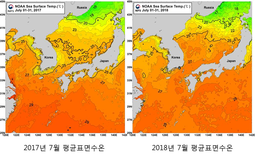 o 국립수산과학원 위성해양정보실에서 수신한 NOAA위성 관측 표면수온 자료를 분석한 2017년 7월 평균표면수온(좌), 2018년 7월 평균표면수온(우)입니다. o 한국근해 2017년 7월 평균 표면수온은 동해 22∼25℃, 남해 23∼27℃, 서해 22∼26℃의 분포를 보이며, 2018년 7월 평균 표면수온은 동해 26∼27℃, 남해 25∼27℃, 서해 22∼26℃로 나타납니다. o 전년에 비해 7월 평균 표면수온은 동·남해 2∼4℃ 높게, 서해 비슷하게 나타나며, 동해연안의 경우 1∼4℃ 높은 분포를, 남해 연안에서는 2∼3℃ 높은 분포를 뛰지만 서·남해 근해역은 전년에 비해 비슷한 분포를 보입니다.