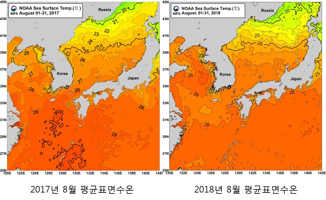 o 국립수산과학원 위성해양정보실에서 수신한 NOAA위성 관측 표면수온 자료를 분석한 2017년 8월 평균표면수온(좌), 2018년 8월 평균표면수온(우)입니다. o 한국근해 2017년 8월 평균 표면수온은 동해 24∼27℃, 남해 25∼29℃, 서해 24∼27℃의 분포를 보이며, 2018년 8월 평균 표면수온은 동해 25∼27℃, 남해 25∼28℃, 서해 24∼28℃로 나타납니다. o 전년에 비해 8월 평균 표면수온은 동·서·남해 1∼2℃ 높게 나타나며, 전년보다 서해연안은 비슷하게, 근해역은 1℃ 내외의 높은 분포를, 동해연안은 2∼3℃ 높은 분포를 뛰지만 근해역은 1∼1.5℃ 높은 분포를 보입니다.