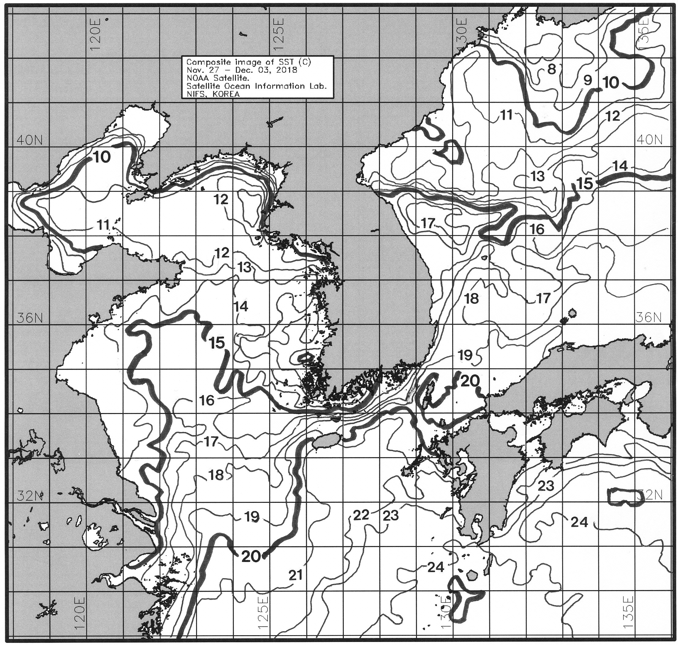 ㅇ 금주(2018. 11. 27 ~ 2018. 12. 03)의 한국근해 표면수온은 대화퇴 근해 14~15도, 울릉도-독도 근해 17~18도, 대마도 근해 20~21도, 제주도 근해 19~21도, 이어도 근해 18~19도, 가거초 근해 15~16도, 어청도 근해 12~13도, 백령도 근해 11∼13도 로 나타납니다. ㅇ「평년에 비해」대화퇴 근해 1도 높게, 울릉도-독도 근해 1도 높게, 대마도 근해 비슷하게, 제주도 근해 비슷하게, 이어도 근해 비슷하게, 가거초 근해 0.5도 높게, 어청도 근해 0.5도 낮게 나타납니다. ㅇ「전년에 비해」대화퇴 근해 2.5도 높게, 울릉도-독도 근해 2도 높게, 대마도 근해 비슷하게, 제주도 근해 비슷하게, 이어도 근해 1도 높게, 가거초 근해 2도 높게, 어청도 근해 2도 높게, 백령도 근해 0.5도 높게 나타납니다.