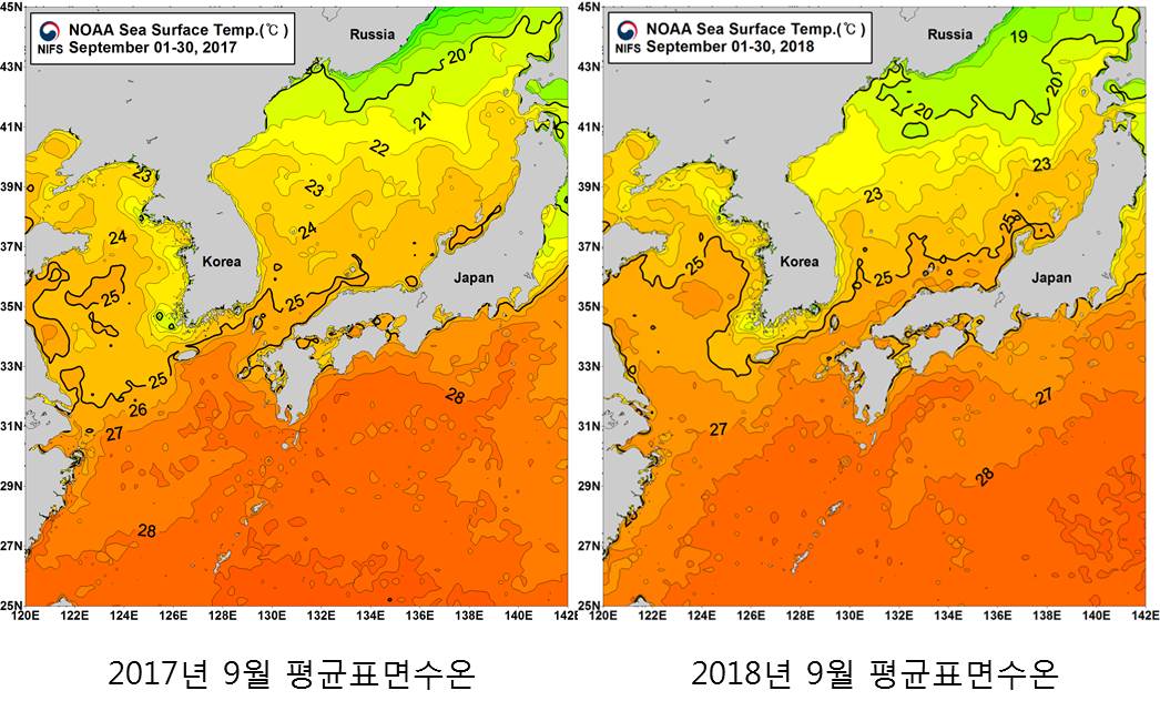 o 국립수산과학원 위성해양정보실에서 수신한 NOAA위성 관측 표면수온 자료를 분석한 2017년 9월 평균표면수온(좌), 2018년 9월 평균표면수온(우)입니다. o 한국근해 2017년 9월 평균 표면수온은 동해 23∼24℃, 남해 24∼26℃, 서해 20∼24℃의 분포를 보이며, 2018년 9월 평균 표면수온은 동해 22∼25℃, 남해 23∼26℃, 서해 21∼25℃로 나타납니다. o 전년에 비해 9월 평균 표면수온은 동·서·남해 비슷하거나 1℃ 높게 나타나며, 동해연안은 전년보다 1℃ 낮은 분포를 보입니다.