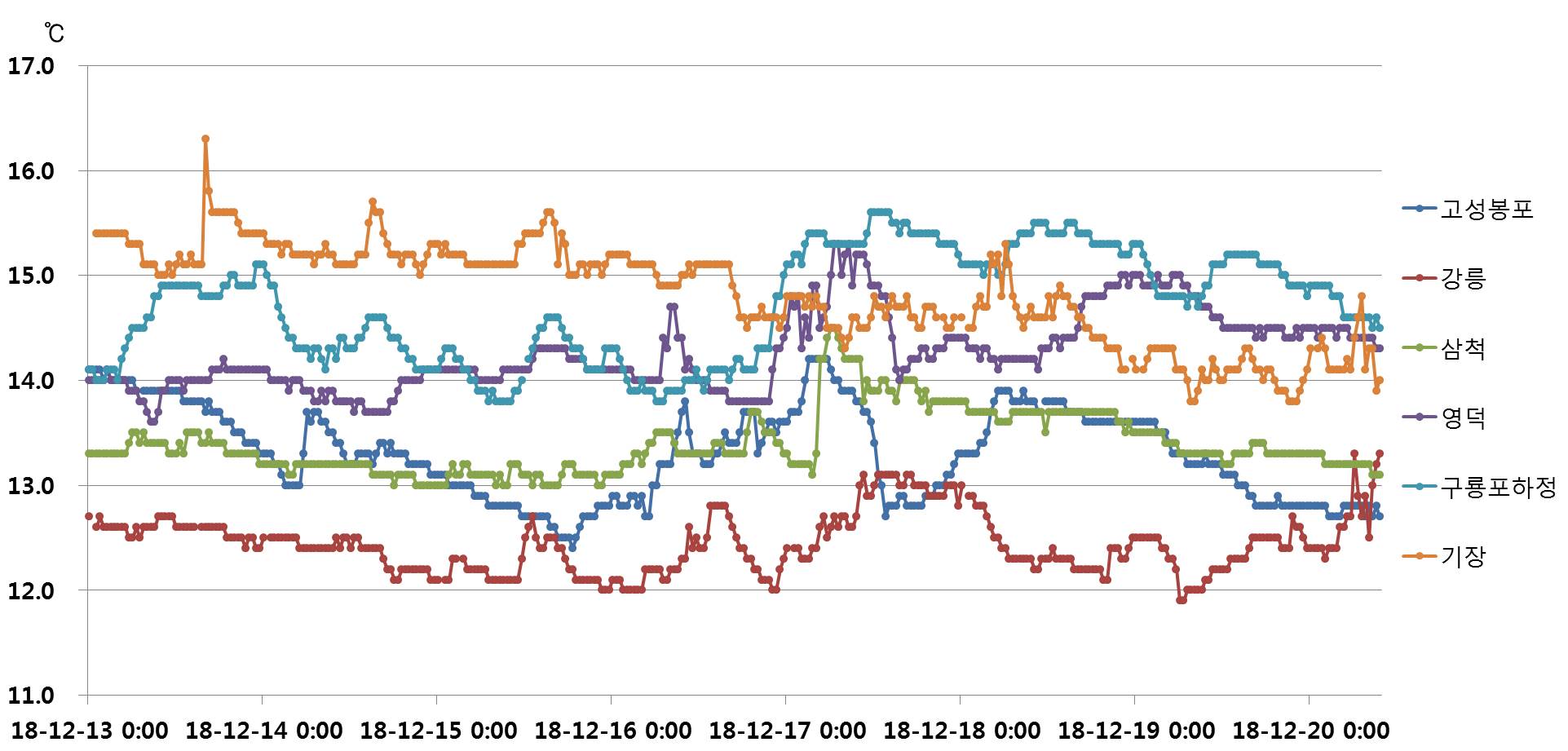 o 국립수산과학원 실시간 해양환경 어장정보시스템에서 12월13일 00시~12월20일 09시까지 관측한 동해 중부 및 남부 연안 수온 변화 경향은 아래와 같습니다. o 12월 20일 09시 현재 동해중부 및 남부 연안 표층 수온은 고성 봉포 12.8℃, 강릉 13.2℃, 삼척 13.1℃, 영덕 14.3℃, 구룡포 하정 14.6℃, 기장 13.9℃를 보였습니다. o 관측기간 동안 동해중부 및 남부 연안(고성 봉포, 강릉, 삼척, 영덕, 구룡포 하정, 기장) 수온은 대체로 11.9~16.3℃의 분포를 보였으며, 관측정점별 수온편차는 1.4∼2.5℃ 내외의 수온변동을 보였습니다. o 겨울철 한파에 따라 수온 변동이 발생할 수 있으니 국립수산과학원 실시간 해양환경 어장정보시스템에서 제공하는 수온정보를 적극적으로 활용하여 수온 변동 경향을 주시해 주시기 바랍니다.