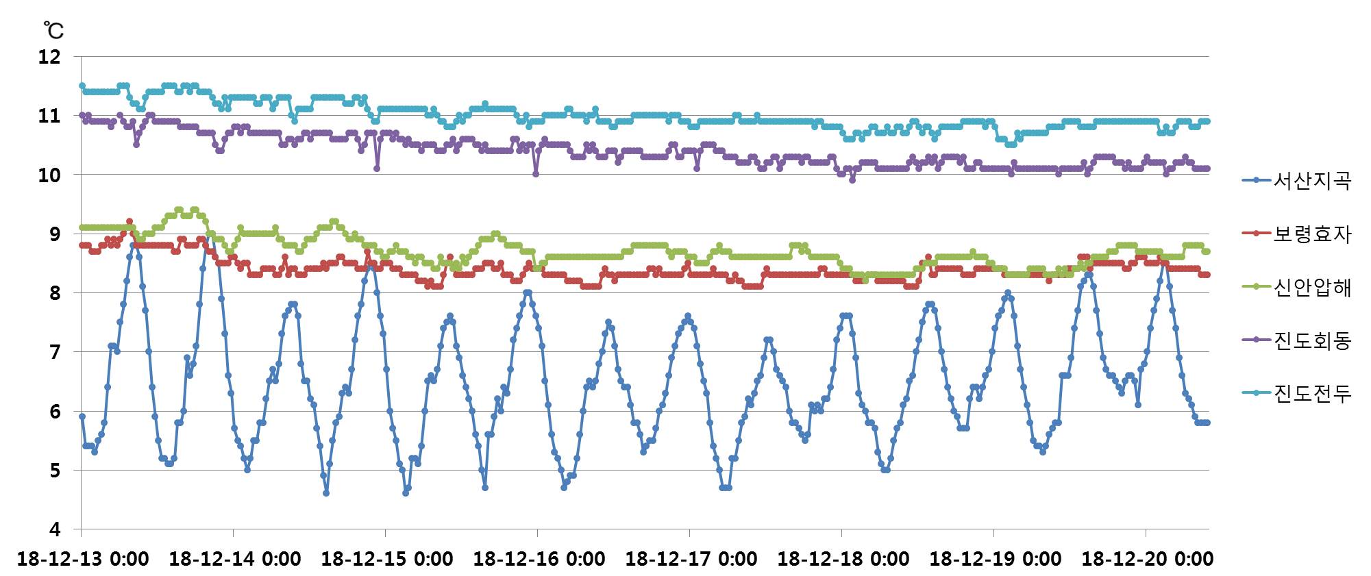 o 국립수산과학원의 실시간 해양환경 어장정보시스템 관측 자료 분석 결과, 서해 (서산지곡, 보령효자도, 신안압해, 진도회동, 진도전두)에서 12월13일 00시∼12월 20일 09시 현재 수온 변화 경향은 아래와 같습니다. o 12월20일 09시 현재 표층 수온은 서산지곡 5.8℃, 보령효자도 8.3℃, 신안압해 8.7℃, 진도회동 10.1℃, 진도전두 10.9℃를 보였습니다. o 관측기간 동안 서해(서산지곡, 보령효자도, 신안압해, 진도회동, 진도전두)연안 수온은 대체로 8.1~11.5℃의 분포를 보였으며, 서산지곡을 제외한 관측정점별 수온편차는 1.0∼1.2℃ 내외의 수온변동을 보였습니다. o 겨울철 한파에 따라 수온 변동이 발생할 수 있으며, 특히 서해의 경우 조수간만차로 인해 수온 편차가 크게 발생할 수 있으니 국립수산과학원 실시간 해양환경 어장정보시스템에서 제공하는 수온정보를 적극적으로 활용하여 수온 변동 경향을 주시해 주시기 바랍니다.