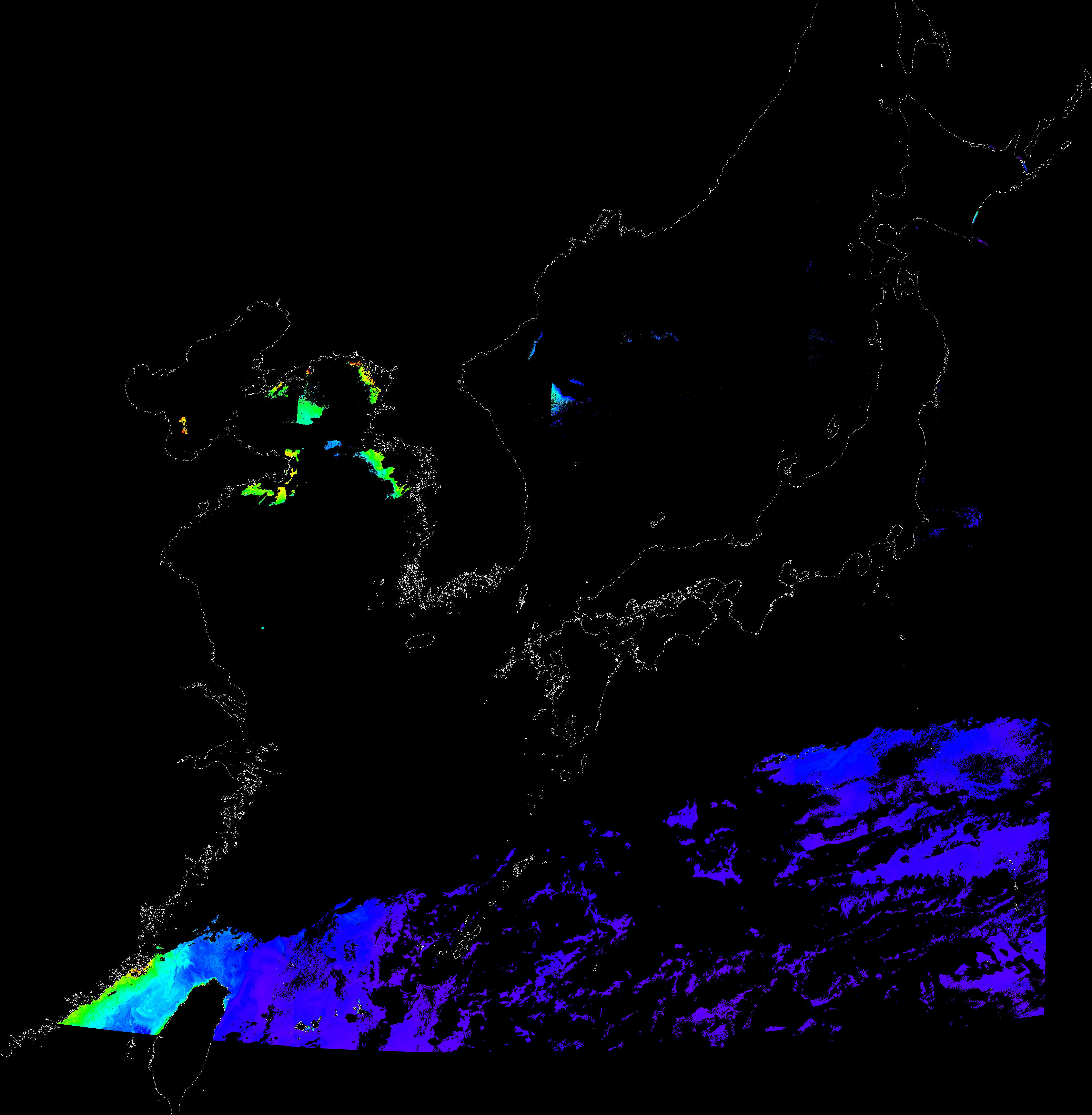 o 2018년 12월 20일 천리안 GOCI 클로로필 a 위성영상입니다. [ GOCI : Geostationary Ocean Color Imager ] o 농도분포는 하단 범례를 참고하시기 바랍니다. o 검은색은 구름을 나타냅니다.
