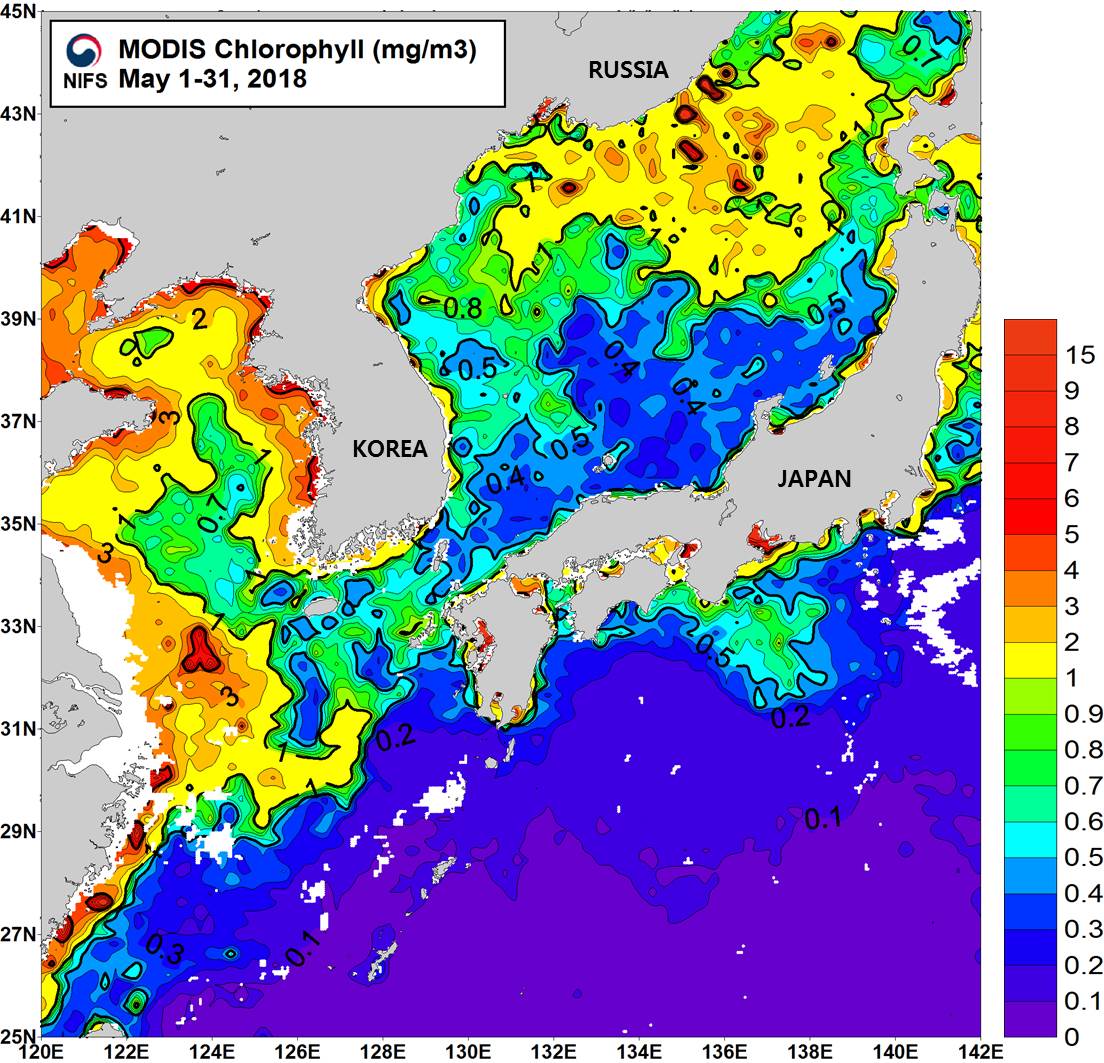 o 국립수산과학원 위성해양 정보실에서는 TERRA/AQUA위성 관측 자료를 매일 수신하고 있습니다. o TERRA/AQUA 위성관측 센서인 MODIS 자료를 사용하여 분석한 2018년 5월 월평균 클로로필 자료는 아래와 같습니다. o 2018년 5월 한국근해 월평균 클로로필의 경우 동해는 0.5∼1.0mg/㎥, 제주도를 포함한 남해는 0.6∼3.0mg/㎥ 및 서해는 0.9∼6.0mg/㎥의 분포를 보였습니다.
