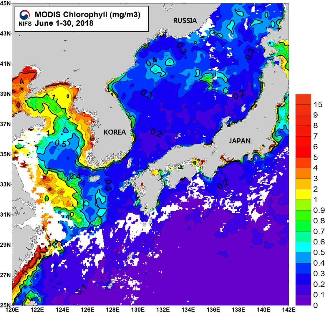 o 국립수산과학원 위성해양 정보실에서는 TERRA/AQUA위성 관측 자료를 매일 수신하고 있습니다. o TERRA/AQUA 위성관측 센서인 MODIS 자료를 사용하여 분석한 2018년 6월 월평균 클로로필 자료는 아래와 같습니다. o 2018년 6월 한국근해 월평균 클로로필의 경우 동해는 0.3∼2.0mg/㎥, 제주도를 포함한 남해는 0.3∼2.0mg/㎥ 및 서해는 0.5∼5.0mg/㎥의 분포를 보였습니다.