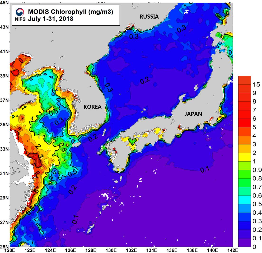 o 국립수산과학원 위성해양 정보실에서는 TERRA/AQUA위성 관측 자료를 매일 수신하고 있습니다. o TERRA/AQUA 위성관측 센서인 MODIS 자료를 사용하여 분석한 2018년 7월 월평균 클로로필 자료는 아래와 같습니다. o 2018년 7월 한국근해 월평균 클로로필의 경우 동해는 0.2∼1.0mg/㎥, 제주도를 포함한 남해는 0.2∼2.0mg/㎥ 및 서해는 0.3∼5.0mg/㎥의 분포를 보였습니다.
