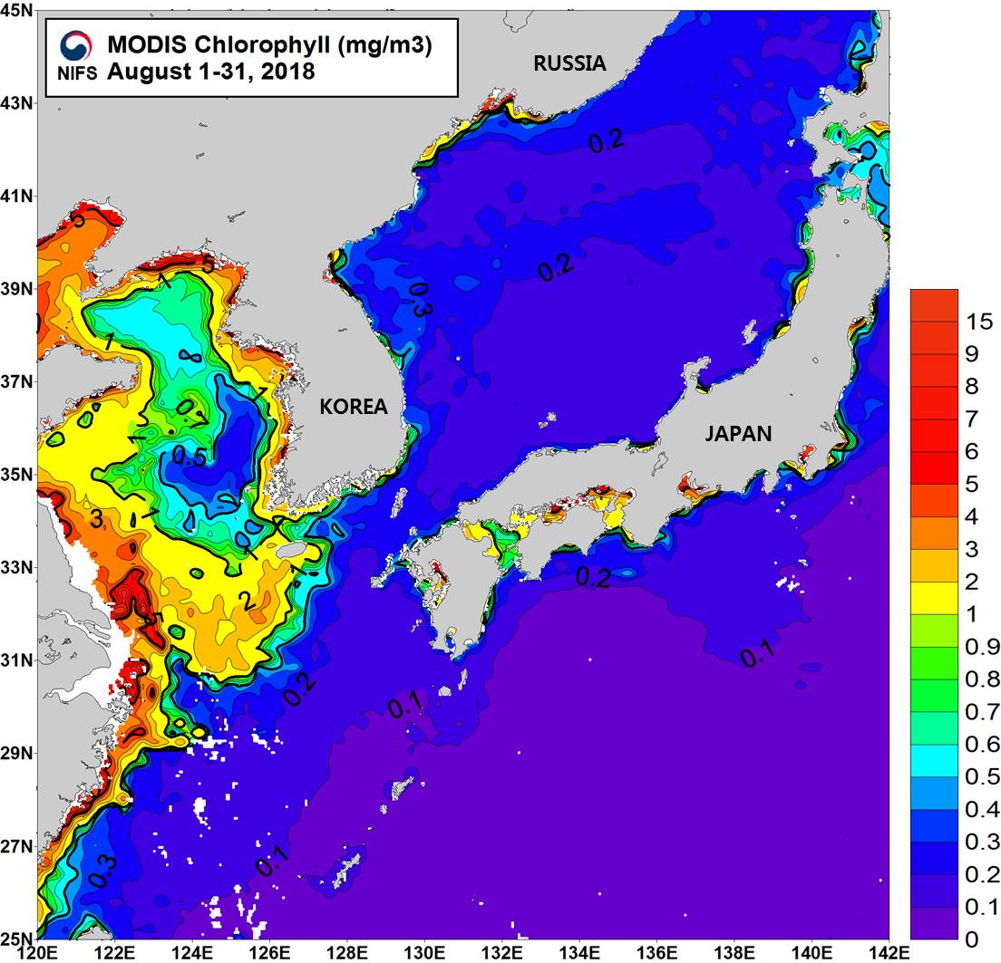 o 국립수산과학원 위성해양 정보실에서는 TERRA/AQUA위성 관측 자료를 매일 수신하고 있습니다. o TERRA/AQUA 위성관측 센서인 MODIS 자료를 사용하여 분석한 2018년 8월 월평균 클로로필 자료는 아래와 같습니다. o 2018년 8월 한국근해 월평균 클로로필의 경우 동해는 0.2∼0.8mg/㎥, 제주도를 포함한 남해는 0.7∼1.0mg/㎥ 및 서해는 0.5∼5.0mg/㎥의 분포를 보였습니다.