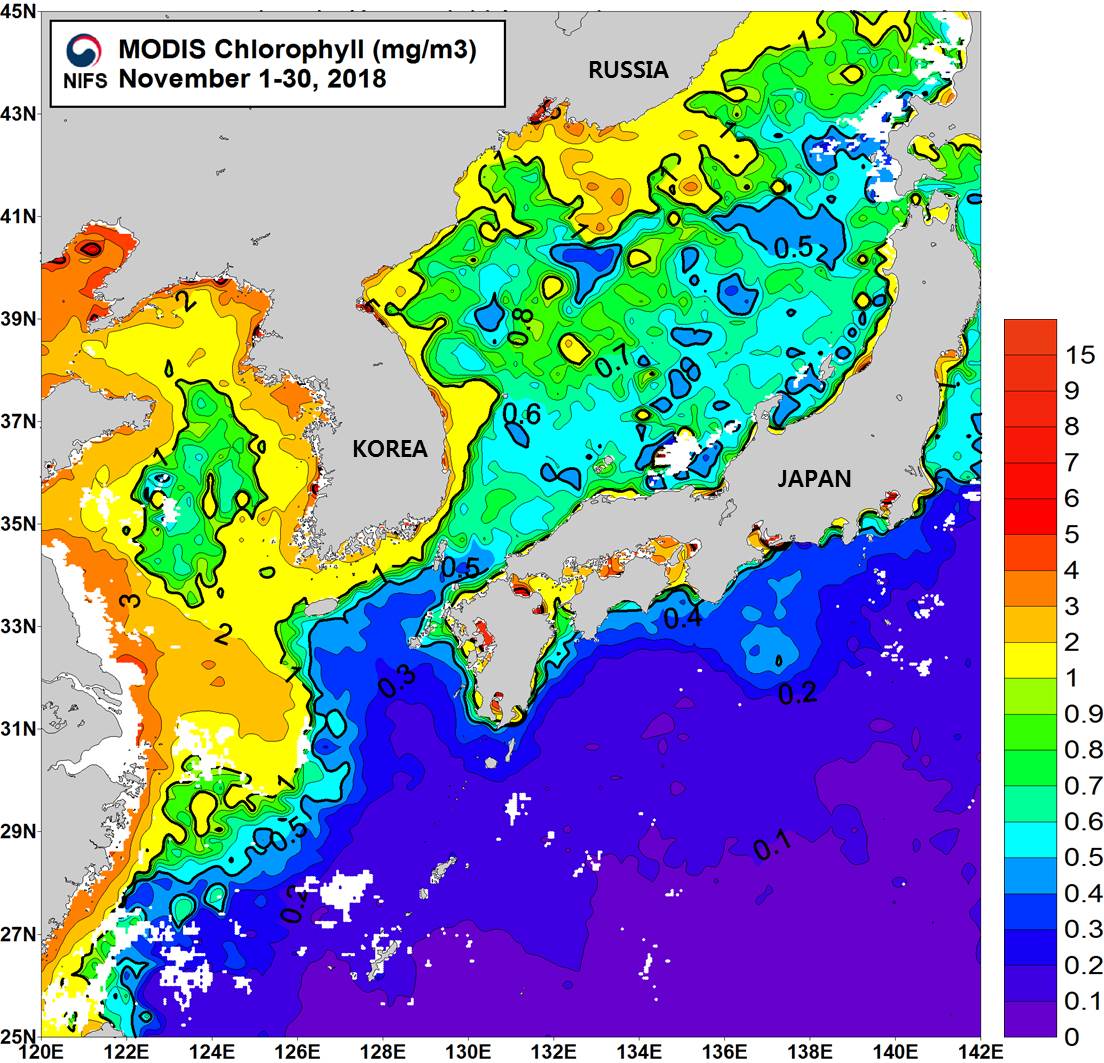 o 국립수산과학원 위성해양 정보실에서는 TERRA/AQUA위성 관측 자료를 매일 수신하고 있습니다. o TERRA/AQUA 위성관측 센서인 MODIS 자료를 사용하여 분석한 2018년 11월 월평균 클로로필 자료는 아래와 같습니다. o 2018년 11월 한국근해 월평균 클로로필의 경우 동해는 0.5∼4.0mg/㎥, 제주도를 포함한 남해는 0.5∼3.0mg/㎥ 및 서해는 1.0∼5.0mg/㎥의 분포를 보였습니다.