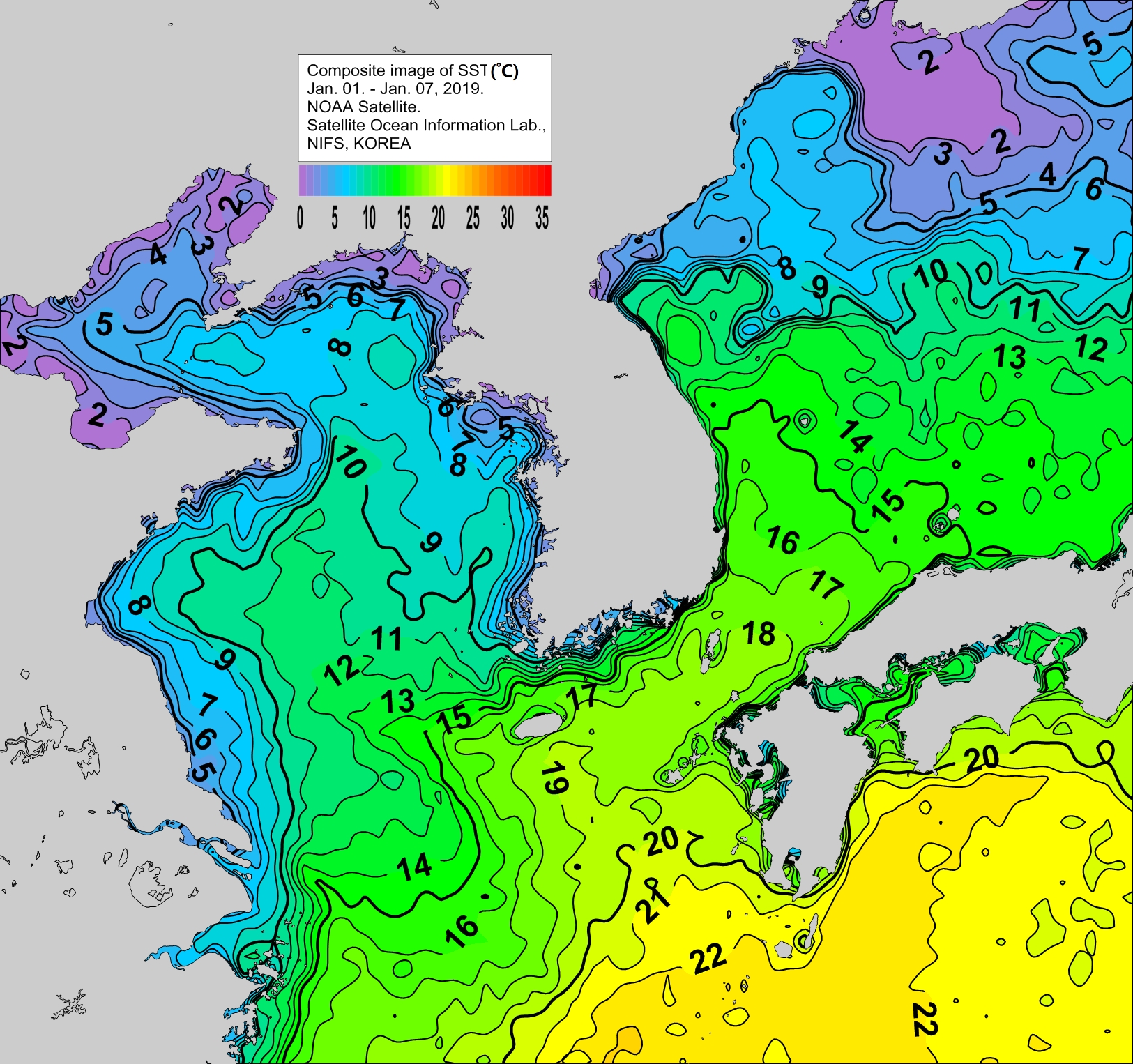 ○ 금주(2019. 01. 01 ~ 2019. 01. 07)의 한국근해 표면수온은 대화퇴 근해 7~9도, 울릉도-독도 근해 13~15도, 대마도 근해 17~18도, 제주도 근해 16~18도, 이어도 근해 13~14도, 가거초 근해 11~13도, 어청도 근해 8~10도, 백령도 근해 6∼8도 로 나타납니다. ○ 「평년에 비해」대화퇴 근해 0.9도 낮게, 울릉도-독도 근해 1도 높게, 대마도 근해 0.5도 높게, 제주도 근해 0.7도 높게, 이어도 근해 비슷하게, 가거초 근해 0.4도 높게, 어청도 근해 0.8도 높게 나타납니다. ○ 「전년에 비해」대화퇴 근해 비슷하게, 울릉도-독도 근해 1.5도 높게, 대마도 근해 0.5도 낮게, 제주도 근해 1도 높게, 이어도 근해 비슷하게, 가거초 근해 1도 높게, 어청도 근해 1.5도 높게, 백령도 근해 1도 낮게 나타납니다.